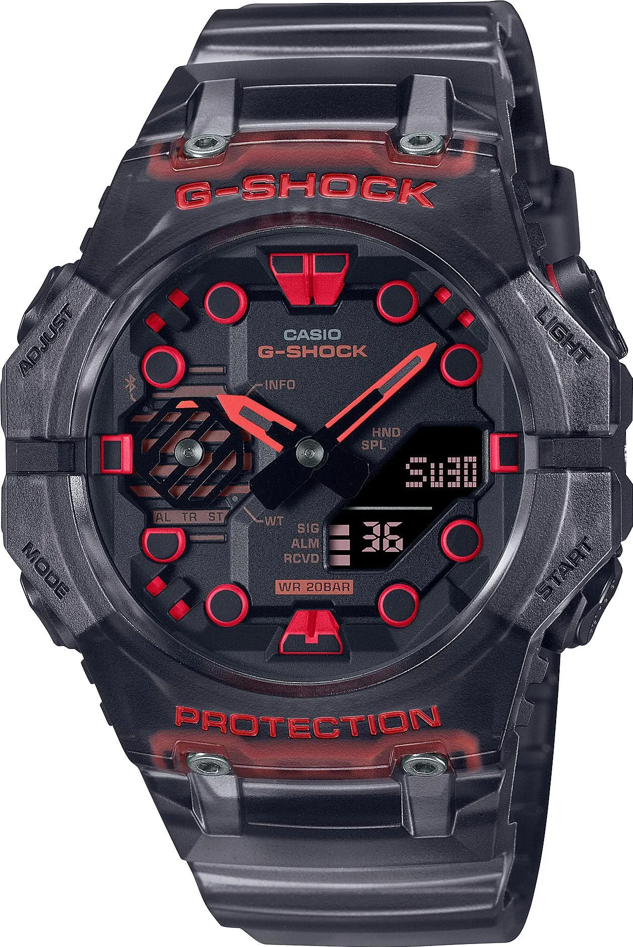 Мужские наручные часы Casio G-Shock GA-B001G-1A. Точный кварцевый механизм с аналого-цифровой индикацией. Полимерный корпус надежно защищает часы от механических повреждений. Светодиодная подсветка. На циферблате отображается текущее число, месяц и день недели. Ударопрочная конструкция часов защищает от ударов и вибрации. Функция Bluetooth позволяет удобно отображать все метрики с часов на экране смартфона, а также выводить на часы уведомления о входящих звонках, сообщениях и имейлах. Функция хронографа. Функция таймера. Таймеры обратного отсчета напомнят Вам о текущих или особенных событиях, издав звуковой сигнал в установленное время. Функция будильника. Аккумулятор обеспечивает часы достаточным питанием приблизительно на 2 года. Отображение текущего времени в основных городах и конкретных областях по всему миру. После настройки автоматический календарь всегда отображает точную дату. Отображение времени возможно в 12-часовом или 24-часовом формате. Полимерный ремешок. Натуральный полимерный материал является идеальным для изготовления ремешка благодаря своей чрезвычайной прочности и гибкости. Прочное, устойчивое к царапинам минеральное стекло защищает часы от повреждений.Часы являются водонепроницаемыми до 20 Бар. Цвет корпуса: Черный. Цвет циферблата: Красный. Ширина (с заводной головкой): 42мм. Толщина: 14мм. Гарантия: 2 года. Другие наименования модели: GA-B001G-1AER.