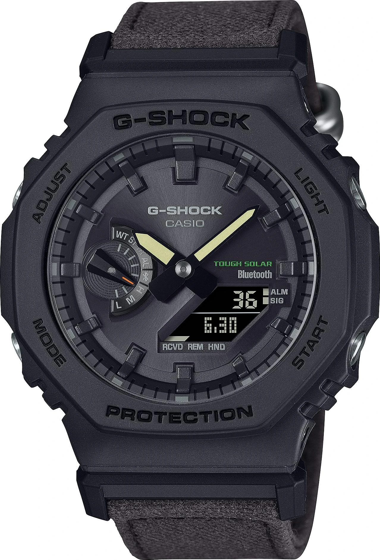 Мужские наручные часы Casio G-Shock GA-B2100CT-1A5. Точный кварцевый механизм с аналого-цифровой индикацией. Текстильный ремешок. После настройки автоматический календарь всегда отображает точную дату. Автоматическая корректировака времени. Для подсветки дисплея используется светодиод, а так же имеет функцию автоматического включения подсветки, если Вы наклоните часы к своему лицу. Функция Bluetooth позволяет удобно отображать все метрики с часов на экране смартфона, а также выводить на часы уведомления о входящих звонках, сообщениях и имейлах. Функция будильника. Ежечасный сигнал. Функция хронографа. Отображение текущего времени в основных городах и конкретных областях по всему миру. Функция перемещения стрелок. Нажатие на кнопку обеспечит перемещение стрелок в такое положение, которое позволит Вам легко считать информацию с маленьких цифровых дисплеев – например, дату или показатели секундомера. Радио-синхронизация. Часы будут получать радио-сигнал калибровки, гарантирующий, что они всегда будут показывать точное время. Солнечная батарейка. Солнечная подзаряжающаяся батарейка обеспечивает питание часов для работы. Функция таймера. Таймеры обратного отсчета напомнят Вам о текущих или особенных событиях, издав звуковой сигнал в установленное время. Ударопрочная конструкция часов защищает от ударов и вибрации. Отображение времени возможно в 12-часовом или 24-часовом формате. Карбоновый браслет. Прочное, устойчивое к царапинам минеральное стекло защищает часы от повреждений. На циферблате отображается текущее число, месяц и день недели. Часы являются водонепроницаемыми до 20 Бар. Цвет циферблата: Черный. Цвет корпуса: Черный. Светодиодная подсветка. Высота (с ушками): 49 мм. Толщина: 12 мм. Гарантия: 2 года.