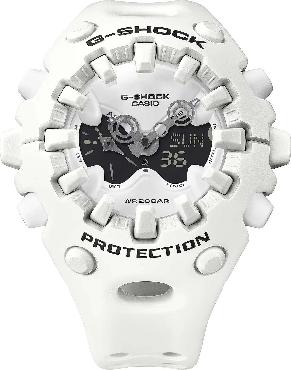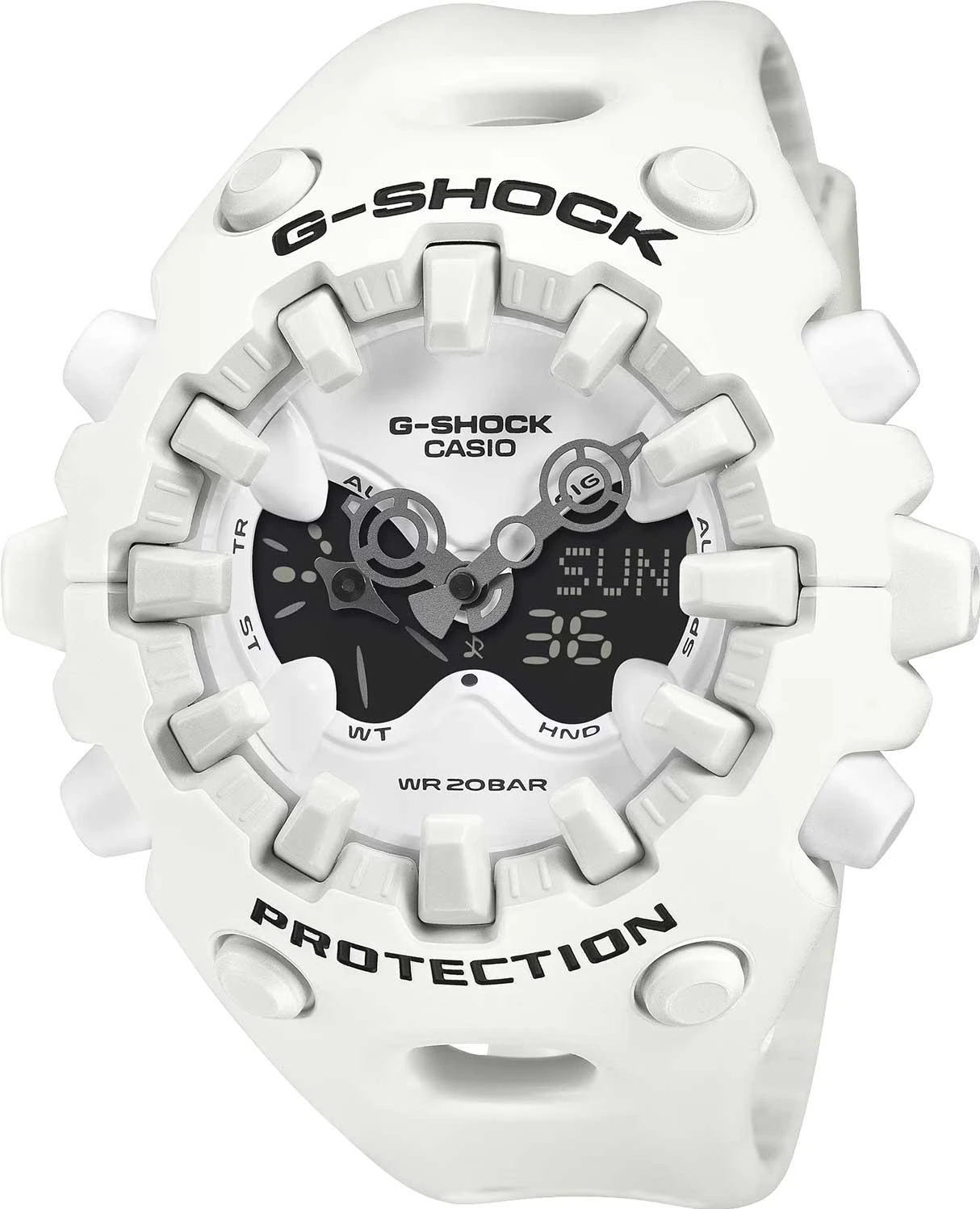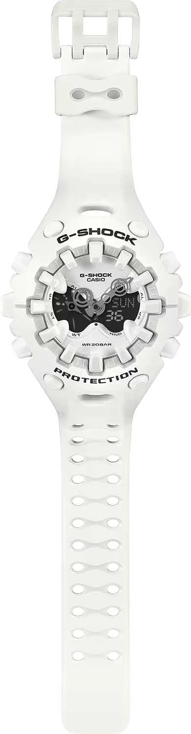 Модель G-Shock с футуристичным дизайном. Противоударный корпус защищает механизм от ударов и вибрации. Двойная подcветка: циферблат и ЖК-дисплеи подсвечиваются светодиодом, благодаря наличию функции задержки, после отпускания кнопки освещение горит еще несколько секунд. Настраиваемое послесвечение 1,5 или 3сек. Цвет подсветки: белый. Необритовое светонакопительное покрытие обеспечивает длительное послесвечение в темноте даже после кратковременного нахождения на свету. 12-ти и 24-х часовой формат времени. Секундомер с двумя точностями показаний: 1/100с (до 1ч) и 1с (после 1ч) и временем измерения 24ч. Режимы измерения: прошедшее время, промежуточное время, время 1-го и 2-го места. Таймер обратного отсчета от 1с до 24ч. Мировое время – 48 городов (31 часовой пояс), всемирное координированное время (UTC). Функция включения/отключения летнего времени. Функции отключения/включения звука и перемещения стрелок для беспрепятственного просмотра информации на цифровых дисплеях. 5 будильников, ежечасный сигнал. Полностью автоматический календарь (до 2099 года). Стальная задняя крышка крепится на 4-х винтах. Батарейка рассчитана на 10 лет. Ремешок из полимерного материала с классической застежкой.