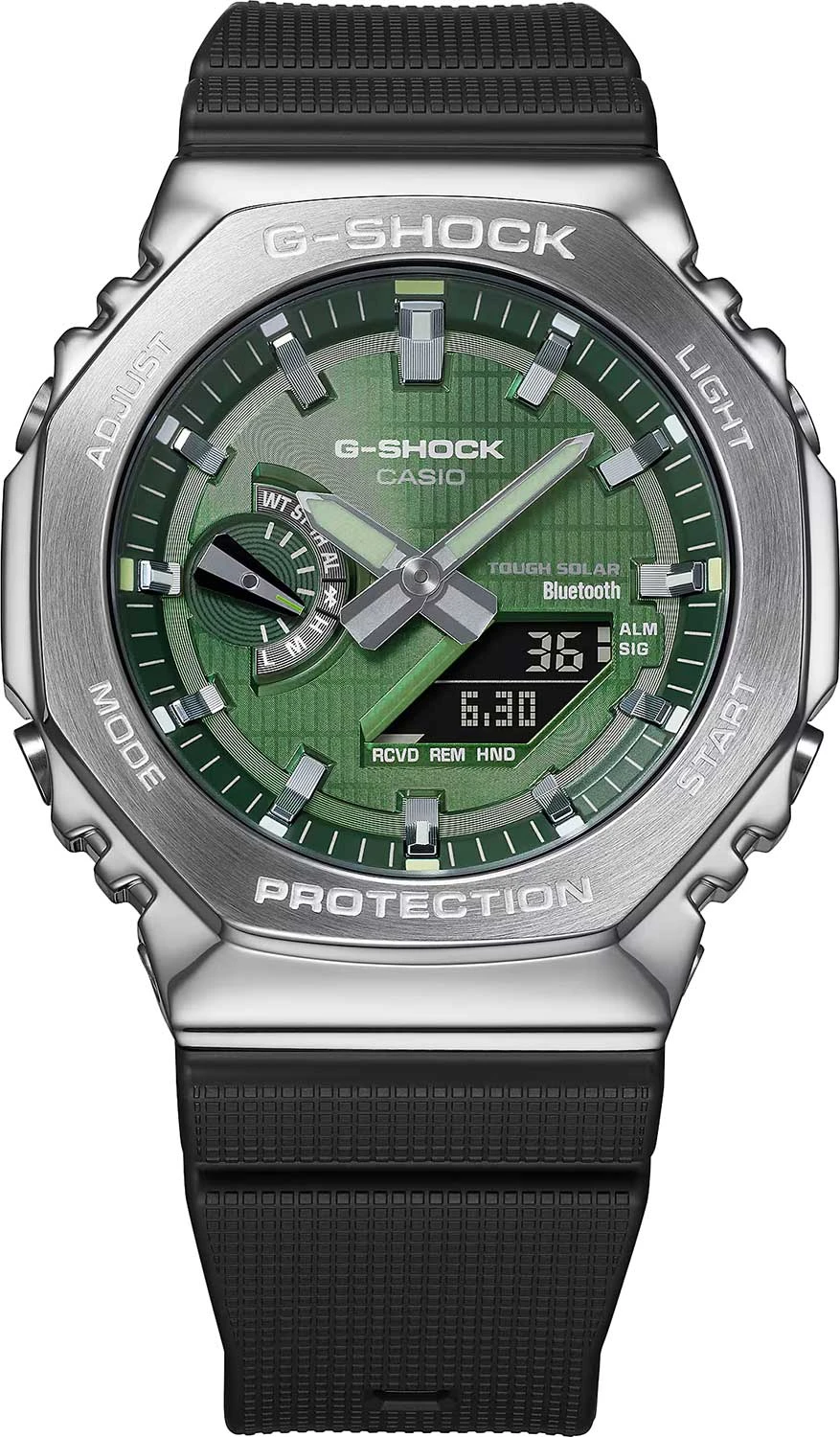 Мужские часы G-Shock Casio GBM-2100A-1A3. Корпус и ремешок выполнены из биопластика, который изготавливается из возобновляемых органических ресурсов. Питание от солнечной энергии Tough Solar — солнечные батарейки большой мощности. Индикатор заряда батареи. Время работы аккумулятора без подзарядки — 7 месяцев, при включенной функции сохранения энергии — 18 месяцев. Противоударный корпус защищает механизм от ударов и вибрации. Двойная подcветка: циферблат и ЖК-дисплеи подсвечиваются светодиодом. Выбираемая продолжительность подсветки (1,5 или 3 секунды), послесвечение. Цвет подсветки: белый. Необритовое светонакопительное покрытие обеспечивает длительное послесвечение в темноте даже после кратковременного нахождения на свету.