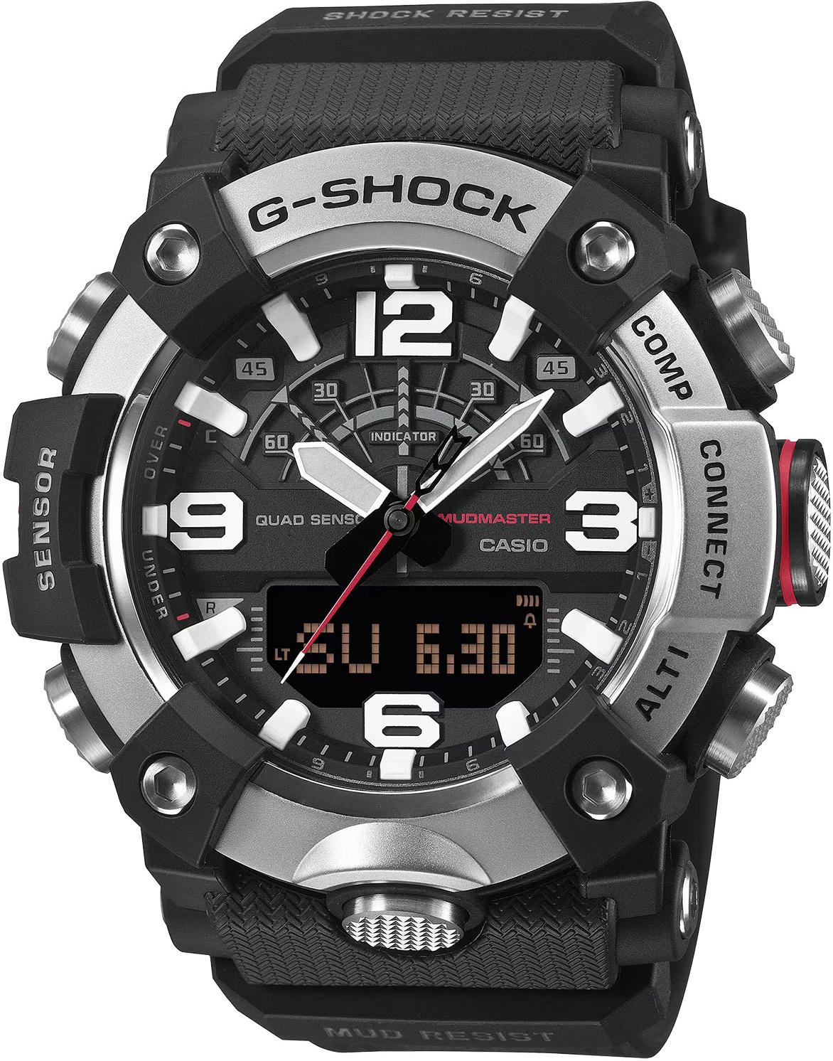 Master of G Mudmaster. Кварцевые мужские часы в корпусе с карбоновым усилением Carbon Core Guard, обеспечивающим исключительную ударопрочность и защиту от вибраций. Особая герметичная конструкция кнопок и корпуса надежно защищает механизм от попадания пыли и грязи. Модель оснащена технологией Bluetooth для синхронизации со смартфоном, автоматической корректировки времени и использования функций приложения CASIO WATCHES. Двойная светодиодная подсветка высокой яркости (Super Illuminator): отдельный светодиод для аналогового циферблата и отдельная подсветка для цифрового дисплея. Система оснащена функцией автоматического включения при наклоне руки к лицу, возможностью выбора длительности свечения (1,5 или 3 секунды) и режимом послесвечения. Цвет подсветки: белый.