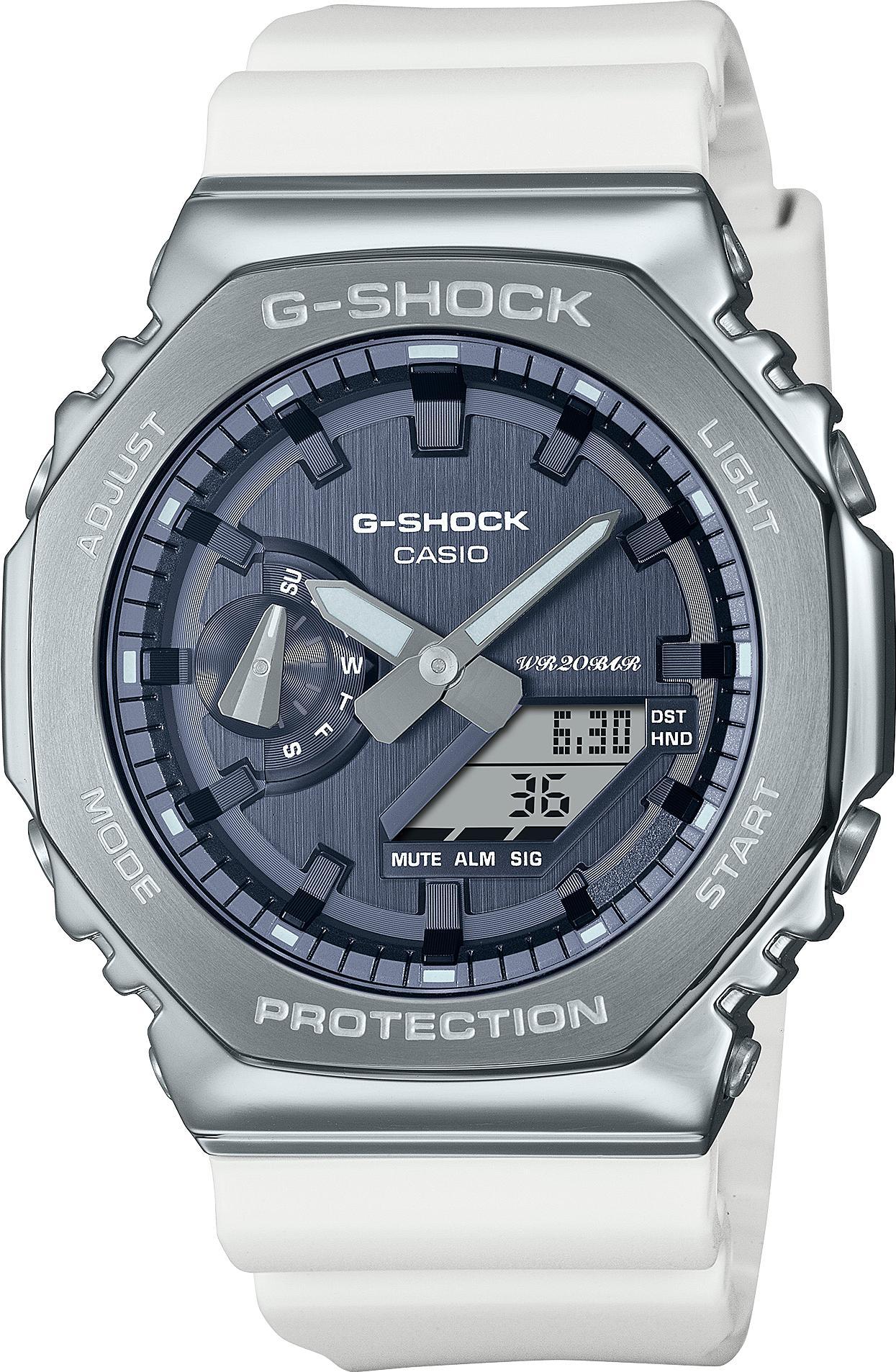 Мужские наручные часы Casio G-Shock GM-2100WS-7A. Точный кварцевый механизм с аналого-цифровой индикацией. Корпус изготовлен из высококачественной нержавеющей стали 316L с высокими антикоррозийными свойствами. На циферблате отображается текущее число, месяц и день недели. Ударопрочная конструкция часов защищает от ударов и вибрации. Функция хронографа. Функция таймера. Таймеры обратного отсчета напомнят Вам о текущих или особенных событиях, издав звуковой сигнал в установленное время. Функция будильника. Аккумулятор обеспечивает часы достаточным питанием приблизительно на 3 года. Отображение текущего времени в основных городах и конкретных областях по всему миру. После настройки автоматический календарь всегда отображает точную дату. Отображение времени возможно в 12-часовом или 24-часовом формате. Полимерный ремешок. Натуральный полимерный материал является идеальным для изготовления ремешка благодаря своей чрезвычайной прочности и гибкости. Прочное, устойчивое к царапинам минеральное стекло защищает часы от повреждений. Часы являются водонепроницаемыми до 20 Бар. Цвет корпуса: Серебристый. Цвет циферблата: Синий. Ширина (с заводной головкой): 49мм. Толщина: 12мм. Гарантия: 2 года.