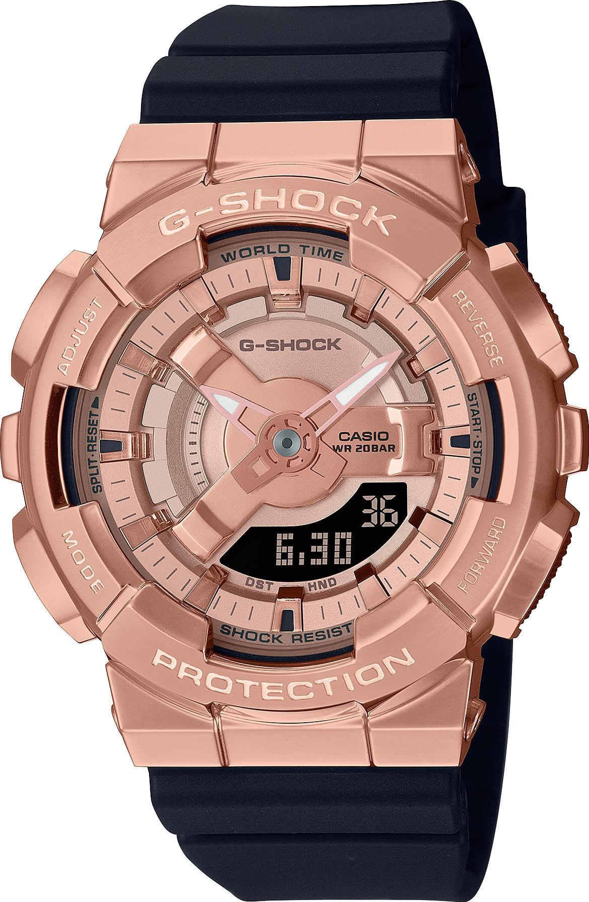 Женские наручные часы Casio G-Shock GM-S110PG-1A. Точный кварцевый механизм с аналого-цифровой индикацией. Корпус изготовлен из высококачественной нержавеющей стали 316L с высокими антикоррозийными свойствами. Светодиодная подсветка. На циферблате отображается текущее число, месяц и день недели. Ударопрочная конструкция часов защищает от ударов и вибрации. Функция хронографа. Функция таймера. Таймеры обратного отсчета напомнят Вам о текущих или особенных событиях, издав звуковой сигнал в установленное время. Функция будильника. Аккумулятор обеспечивает часы достаточным питанием приблизительно на 3 года. Отображение текущего времени в основных городах и конкретных областях по всему миру. После настройки автоматический календарь всегда отображает точную дату. Отображение времени возможно в 12-часовом или 24-часовом формате. Полимерный ремешок. Натуральный полимерный материал является идеальным для изготовления ремешка благодаря своей чрезвычайной прочности и гибкости. Прочное, устойчивое к царапинам минеральное стекло защищает часы от повреждений. Часы являются водонепроницаемыми до 20 Бар. Цвет корпуса: Розовое золото. Цвет циферблата: Розовый. Ширина (с заводной головкой): 46мм. Толщина: 13мм. Гарантия: 2 года. Другие наименования модели: GM-S110PG-1AER.