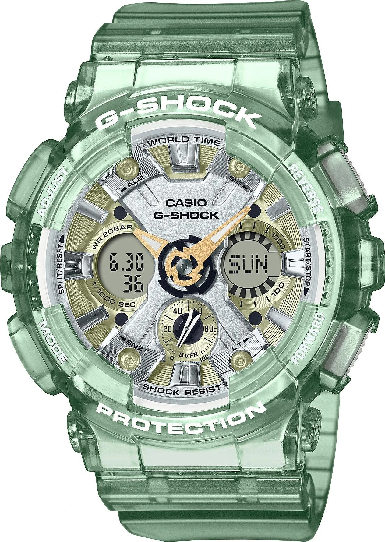 Женские наручные часы Casio G-Shock GMA-S120GS-3A. Точный кварцевый механизм с аналого-цифровой индикацией. Полимерный корпус надежно защищает часы от механических повреждений. Светодиодная подсветка. На циферблате отображается текущее число, месяц и день недели. Ударопрочная конструкция часов защищает от ударов и вибрации. Часы созданы с защитой от воздействия магнитных полей. Функция хронографа. Функция таймера. Таймеры обратного отсчета напомнят Вам о текущих или особенных событиях, издав звуковой сигнал в установленное время. Функция будильника. Аккумулятор обеспечивает часы достаточным питанием приблизительно на 3 года. Индикатор запаса хода. После настройки автоматический календарь всегда отображает точную дату. Отображение времени возможно в 12-часовом или 24-часовом формате. Полимерный ремешок. Натуральный полимерный материал является идеальным для изготовления ремешка благодаря своей чрезвычайной прочности и гибкости. Прочное, устойчивое к царапинам минеральное стекло защищает часы от повреждений.Часы являются водонепроницаемыми до 20 Бар. Цвет корпуса: Зеленый. Цвет циферблата: Зеленый. Ширина (с заводной головкой): 49мм. Толщина: 16мм. Гарантия: 2 года. Другие наименования модели: GMA-S120GS-3AER, GMA-S120GS-3ADR.