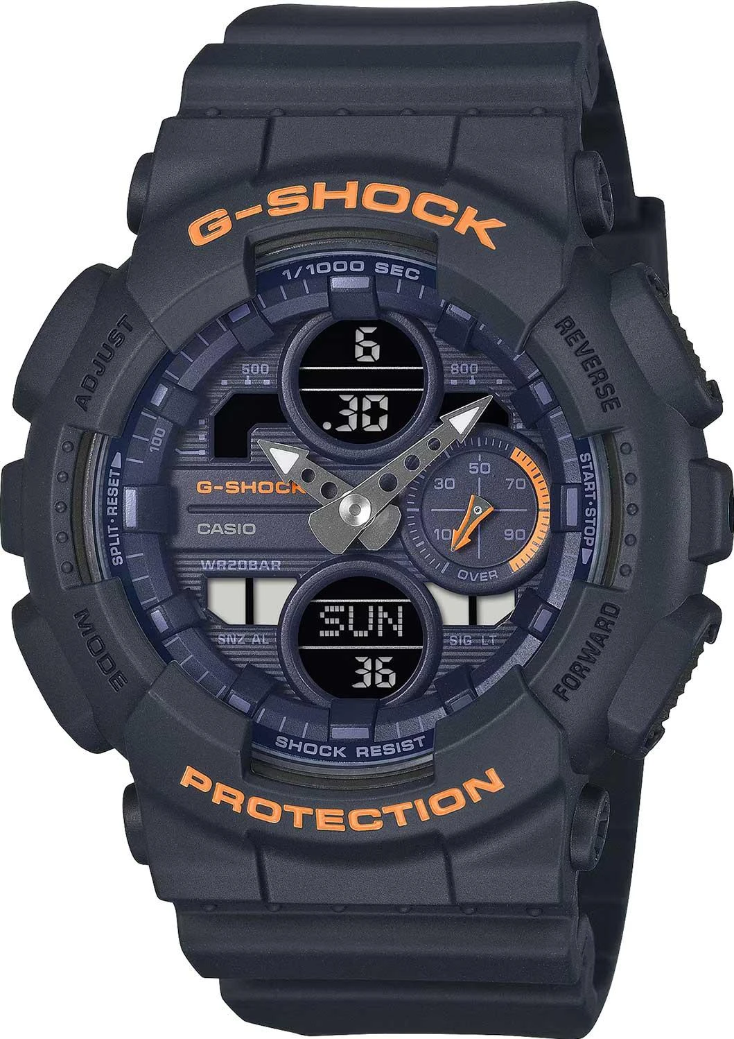 12-ти и 24-х часовой формат времени. Секундомер с точностью показаний 1/1000с и временем измерения 100ч. Расчет скорости по выбранной дистанции. SPLIT-хронограф (хронограф, использующийся для отсчета времени параллельных событий, начавшихся одновременно). Таймер обратного отсчета от 1мин до 24ч с автоповтором. Мировое время – 48 городов (29 часовых поясов), всемирное координированное время (UTC). Функция включения/отключения летнего времени. Переключение между домашним и мировым временем. 5 будильников (один с функцией повтора), ежечасный сигнал. Автоматический календарь до 2099 года. Батарейка рассчитана на 2 года. Стальная задняя крышка крепится на 4-х винтах. Ремешок из полимерного материала с классической застежкой.