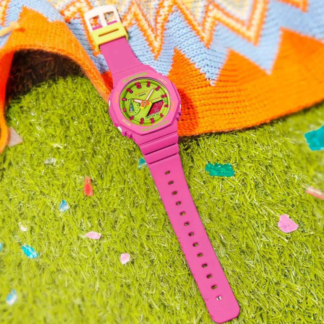 Женские наручные часы Casio G-Shock GMA-S2100BS-4A. Точный кварцевый механизм с аналого-цифровой индикацией. Полимерный ремешок. Натуральный полимерный материал является идеальным для изготовления ремешка благодаря своей чрезвычайной прочности и гибкости. После настройки автоматический календарь всегда отображает точную дату. Для подсветки дисплея используется светодиод, а так же имеет функцию автоматического включения подсветки, если Вы наклоните часы к своему лицу. Аккумулятор обеспечивает часы достаточным питанием приблизительно на 3 года. Функция будильника. Функция хронографа. Отображение текущего времени в основных городах и конкретных областях по всему миру. Функция таймера. Таймеры обратного отсчета напомнят Вам о текущих или особенных событиях, издав звуковой сигнал в установленное время. Ударопрочная конструкция часов защищает от ударов и вибрации. Отображение времени возможно в 12-часовом или 24-часовом формате. Карбоновый браслет. Полимерный ремешок. Натуральный полимерный материал является идеальным для изготовления ремешка благодаря своей чрезвычайной прочности и гибкости. Прочное, устойчивое к царапинам минеральное стекло защищает часы от повреждений. На циферблате отображается текущее число, месяц и день недели. Часы являются водонепроницаемыми до 20 Бар. Цвет циферблата: Розовый. Цвет корпуса: Зеленый. Светодиодная подсветка. На стрелки и отметки нанесен светонакопительный состав, благодаря этому считывать информацию с циферблата возможно и в темноте. Толщина: 11 мм. Гарантия: 2 года.