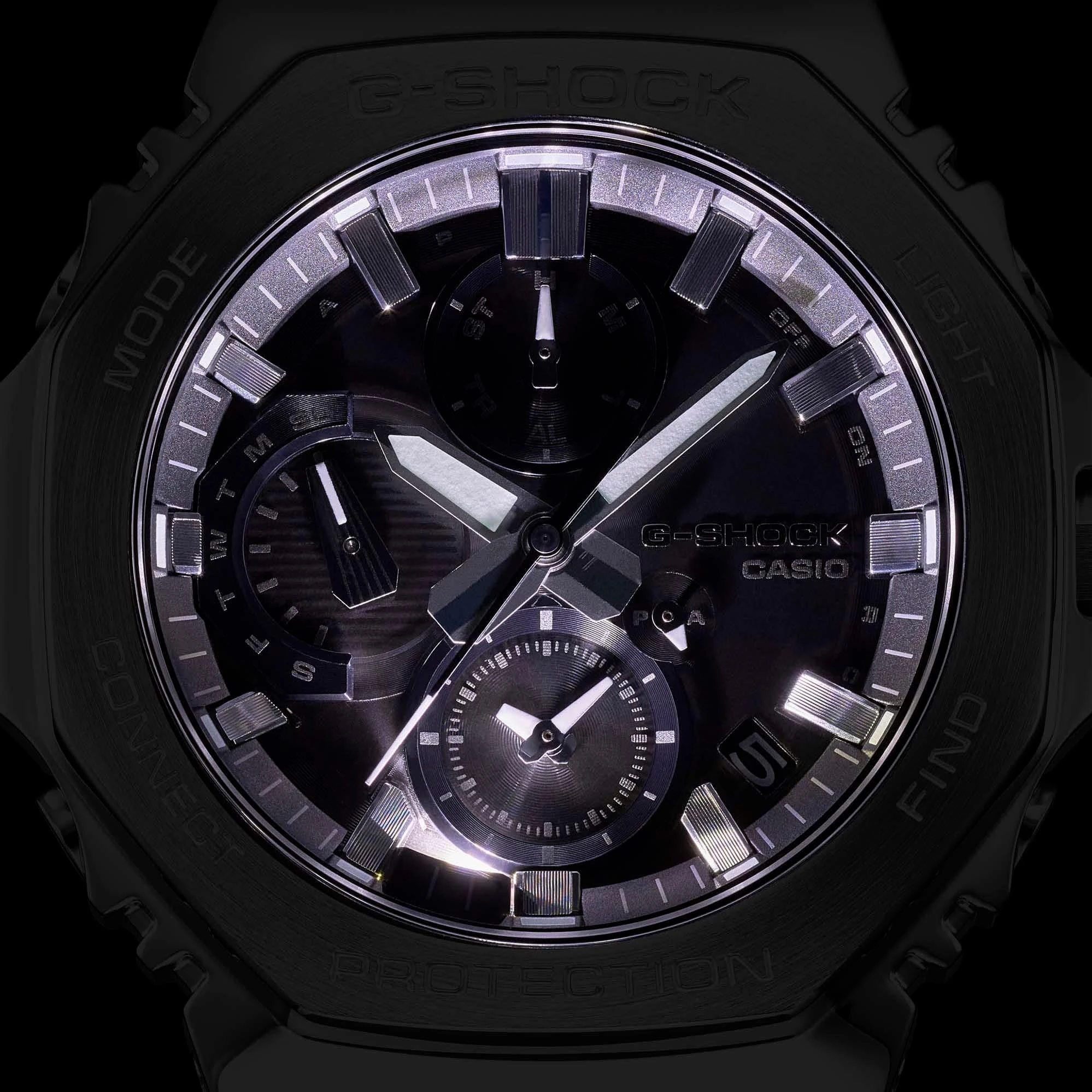 Стильная и брутальная модель 2025 года из серии G-Shock GMC-B2100 в стальном корпусе на черном полимерном ремешке. Брутальная модель в октагоновом корпусе получила полностью аналоговый циферблат черного цвета без цифровых дисплеев и массивную граненую подзаводную головку.<br />