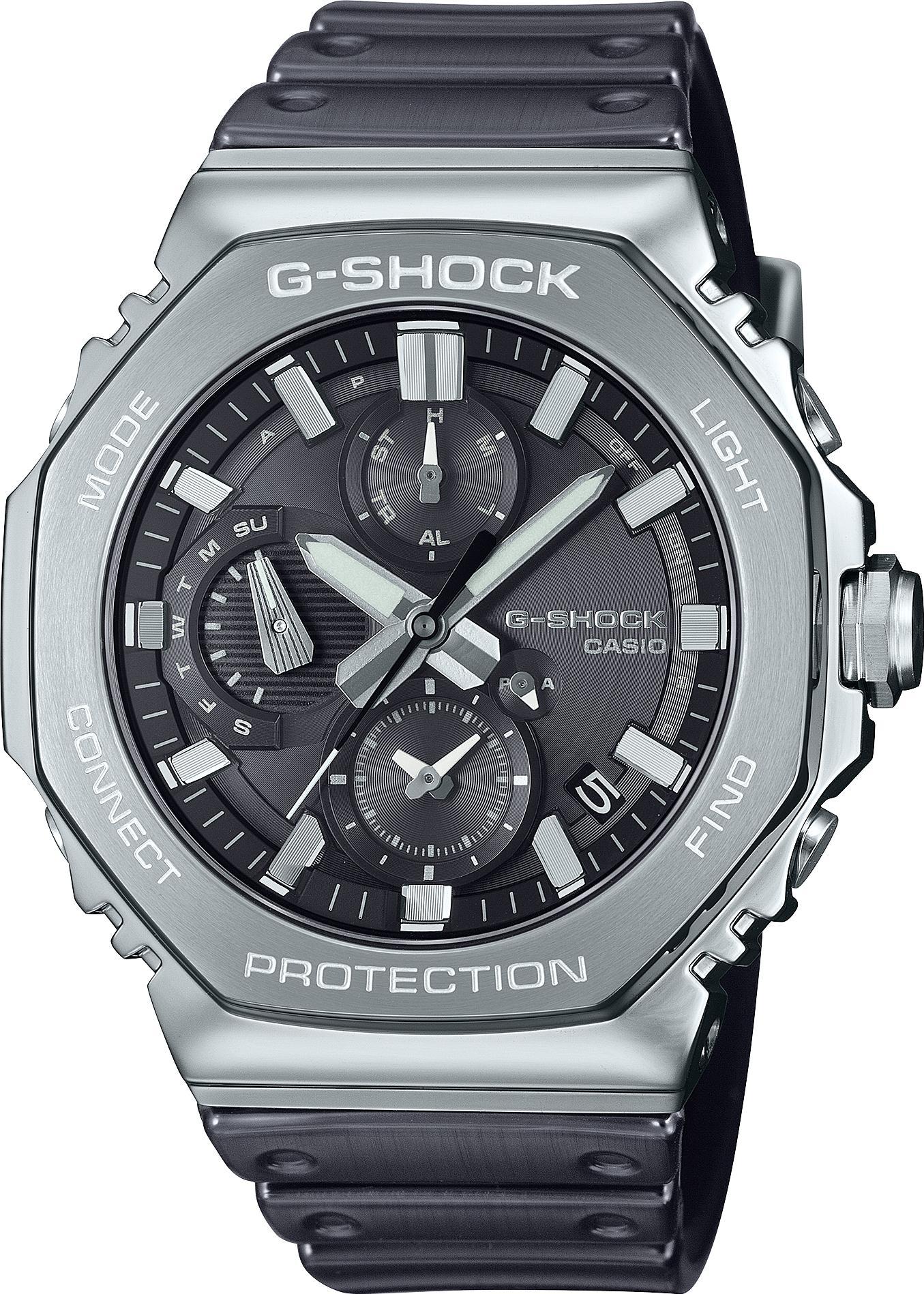 Стильная и брутальная модель 2025 года из серии G-Shock GMC-B2100 в стальном корпусе на черном полимерном ремешке. Брутальная модель в октагоновом корпусе получила полностью аналоговый циферблат черного цвета без цифровых дисплеев и массивную граненую подзаводную головку.