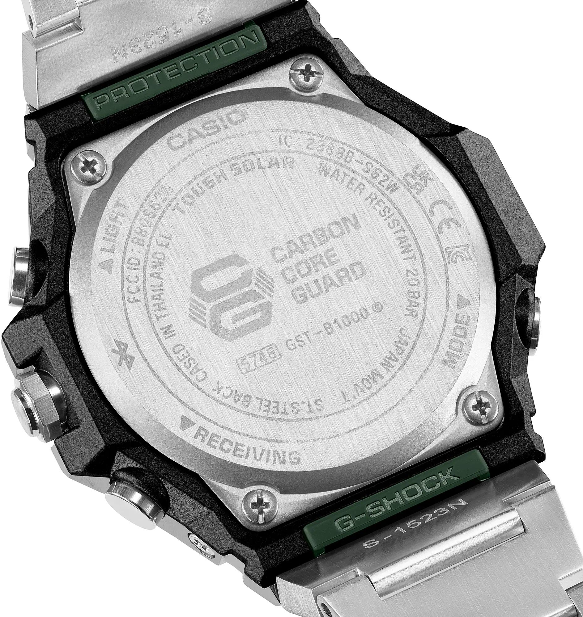 Мужские кварцевые часы на солнечной батарее. Запас хода при полном заряде — 5 месяцев, в режиме энергосбережения — 18 месяцев. Индикатор низкого заряда. Светодиодная подсветка с функцией послесвечения. Синхронизация со смартфоном с помощью Bluetooth. Центральные часовая, минутная и секундная стрелки. Апертура даты между 4 и 5 часами. Отображение дня недели. 12/24х часовой формат времени. Ежедневный будильник. Функция секундомера. Таймер. Автоматический календарь до 2099 года. Зеленый циферблат. Круглый корпус выполнен из карбона и нержавеющей стали. Размер корпуса составляет46,9 х 44,2 х 11,6 мм (ДхШхВ). Завинчивающаяся заводная головка. Стальной браслет, тройная раскладывающаяся застежка. Прочное минеральное стекло, устойчивое к мелким механическим повреждениям. Водостойкость WR 200 (погружение с аквалангом). Вес: 118 г.