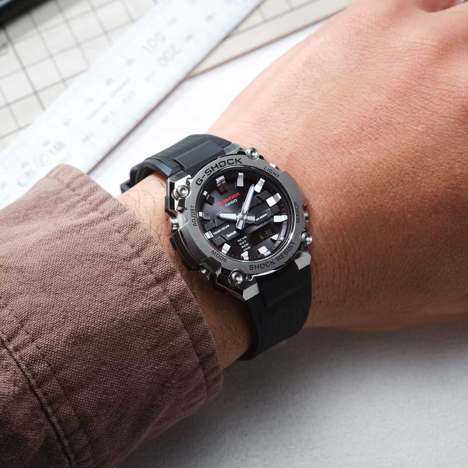 Мужские наручные часы Casio G-Shock GST-B600-1A. Питание от солнечной энергии Tough Solar — солнечные батарейки большой мощности, индикатор заряда батареи. Функция автоматического сохранения энергии. Время работы аккумулятора без подзарядки — приблизительно 7 месяцев, при включенной функции сохранения энергии — приблизительно 18 месяцев. Противоударный корпус защищает механизм от ударов и вибрации. Двойная подcветка: циферблат и ЖК-дисплеи подсвечиваются светодиодом. Выбираемая продолжительность подсветки (1,5 или 3 секунды), послесвечение. Цвет подсветки: белый. Необритовое светонакопительное покрытие обеспечивает длительное послесвечение в темноте даже после кратковременного нахождения на свету. 12-ти и 24-х часовой формат времени. Секундомер с точностью показаний 1сек и временем измерения 1ч. Секундомер с функцией SPLIT. Таймер обратного отсчета от 1сек до 1ч. 5 будильников, ежечасный сигнал. Полностью автоматический календарь (до 2099 года). Мировое время – 38 городов (38 часовых поясов), всемирное координированное время (UTC). Автоматический переход на зимнее и летнее время, возможность включения/отключения данной функции. Переключение между домашним и мировым временем. Беспроводная технология Bluetooth для синхронизации со смартфоном. При подключении к смартфону часы корректируют текущее время, напоминания, а также копируют настройки мирового времени более чем для 300 городов. Функции перемещения стрелок для беспрепятственного просмотра информации на дисплее, отключения/включения звука, поиска телефона. Отображение дней недели на шести языках. Смена отображения даты/месяца. Циферблат с метками в виде штрихов. Стальная задняя крышка крепится на 4-х винтах. Ремешок с классической застежкой.