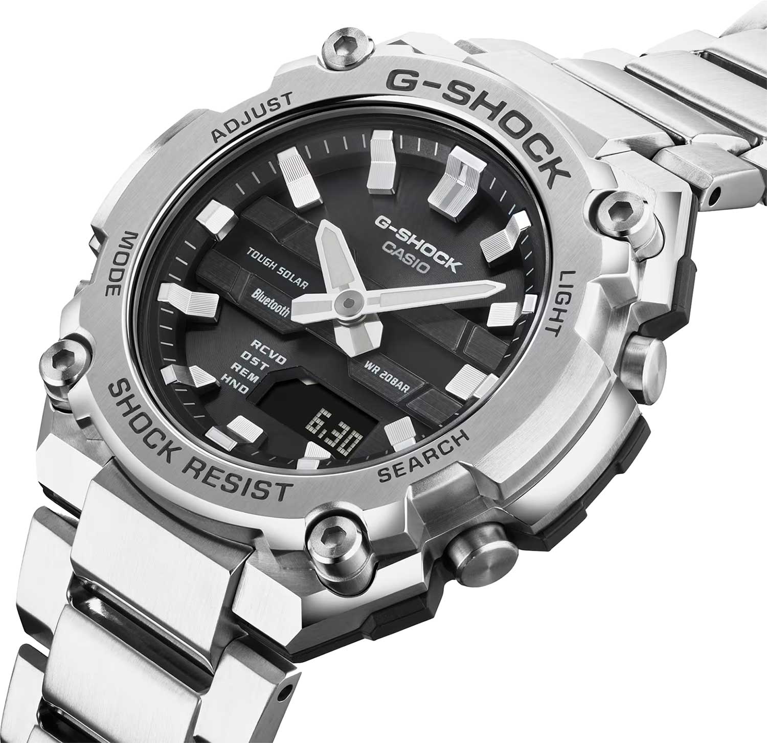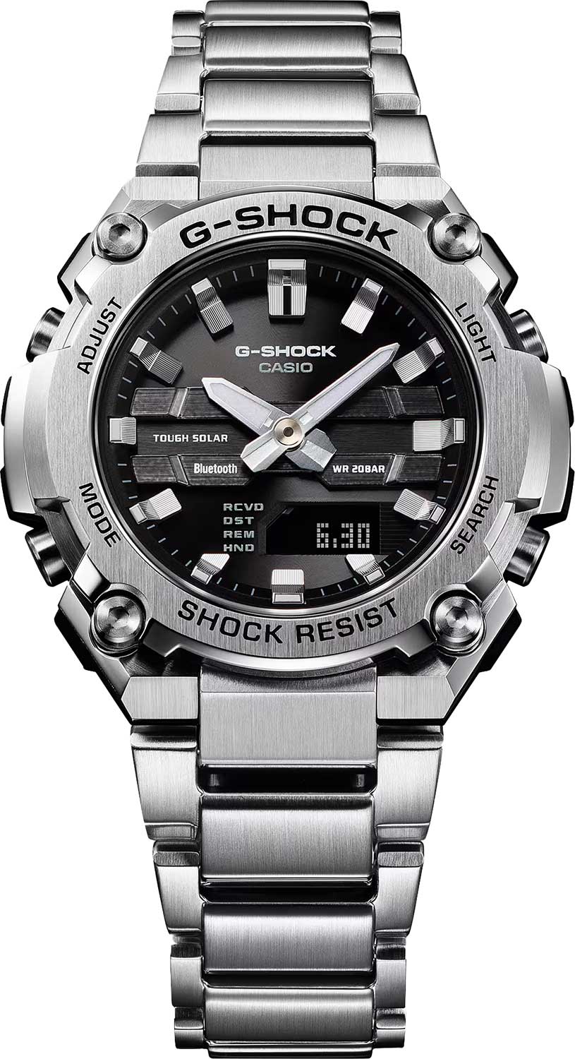 Мужские наручные часы Casio G-Shock GST-B600D-1A. Питание от солнечной энергии Tough Solar — солнечные батарейки большой мощности, индикатор заряда батареи. Время работы аккумулятора без подзарядки — приблизительно 7 месяцев, при включенной функции сохранения энергии — приблизительно 18 месяцев. Противоударный корпус защищает механизм от ударов и вибрации. Двойная подcветка: циферблат и ЖК-дисплеи подсвечиваются светодиодом. Выбираемая продолжительность подсветки (1,5 или 3 секунды), послесвечение. Цвет подсветки: белый. Необритовое светонакопительное покрытие обеспечивает длительное послесвечение в темноте даже после кратковременного нахождения на свету. 12-ти и 24-х часовой формат времени. Секундомер с точностью показаний 1сек и временем измерения 1ч. Секундомер с функцией SPLIT (промежуточное время). Таймер обратного отсчета от 1сек до 1ч. 5 будильников, ежечасный сигнал. Полностью автоматический календарь (до 2099 года). Мировое время – 38 городов (38 часовых поясов), всемирное координированное время (UTC). Автоматический переход на зимнее и летнее время, возможность включения/отключения данной функции. Переключение между домашним и мировым временем. Беспроводная технология Bluetooth для синхронизации со смартфоном. При подключении к смартфону часы корректируют текущее время, напоминания, а также копируют настройки мирового времени более чем для 300 городов. Функции перемещения стрелок для беспрепятственного просмотра информации на дисплее, отключения/включения звука, поиска телефона. Отображение дней недели на шести языках. Смена отображения даты/месяца. Циферблат с метками в виде штрихов. Стальная задняя крышка крепится на 4-х винтах. Литой браслет с тройной раскладывающейся застежкой, расстегиваемой одним касанием.