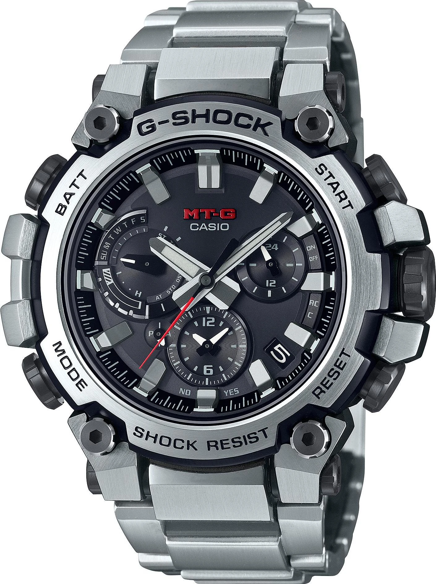 Мужские наручные часы Casio G-Shock MTG-B3000D-1A. Точный кварцевый механизм с аналоговой индикацией. Корпус изготовлен из высококачественной нержавеющей стали 316L с высокими антикоррозийными свойствами. Светодиодная подсветка. На циферблате отображается текущее число месяца. Ударопрочная конструкция часов защищает от ударов и вибрации. Солнечная батарейка. Солнечная подзаряжающаяся батарейка обеспечивает питание часов для работы. Радио-синхронизация. Часы будут получать радио-сигнал калибровки, гарантирующий, что они всегда будут показывать точное время. Функция Bluetooth позволяет удобно отображать все метрики с часов на экране смартфона, а также выводить на часы уведомления о входящих звонках, сообщениях и имейлах. Функция хронографа. Функция таймера. Таймеры обратного отсчета напомнят Вам о текущих или особенных событиях, издав звуковой сигнал в установленное время. Для подсветки дисплея используется светодиод, а так же имеет функцию автоматического включения подсветки, если Вы наклоните часы к своему лицу. Функция будильника. Индикатор запаса хода. После настройки автоматический календарь всегда отображает точную дату. Браслет из нержавеющей стали. Сапфировое стекло. Искусственно изготовленное стекло с высокой прочностью и устойчивостью к царапинам. Часы являются водонепроницаемыми до 20 Бар. Цвет корпуса: Серебристый. Цвет циферблата: Черный. Ширина (с заводной головкой): 52мм. Толщина: 12мм. Гарантия: 2 года. Другие наименования модели: MTG-B3000D-1AER.
