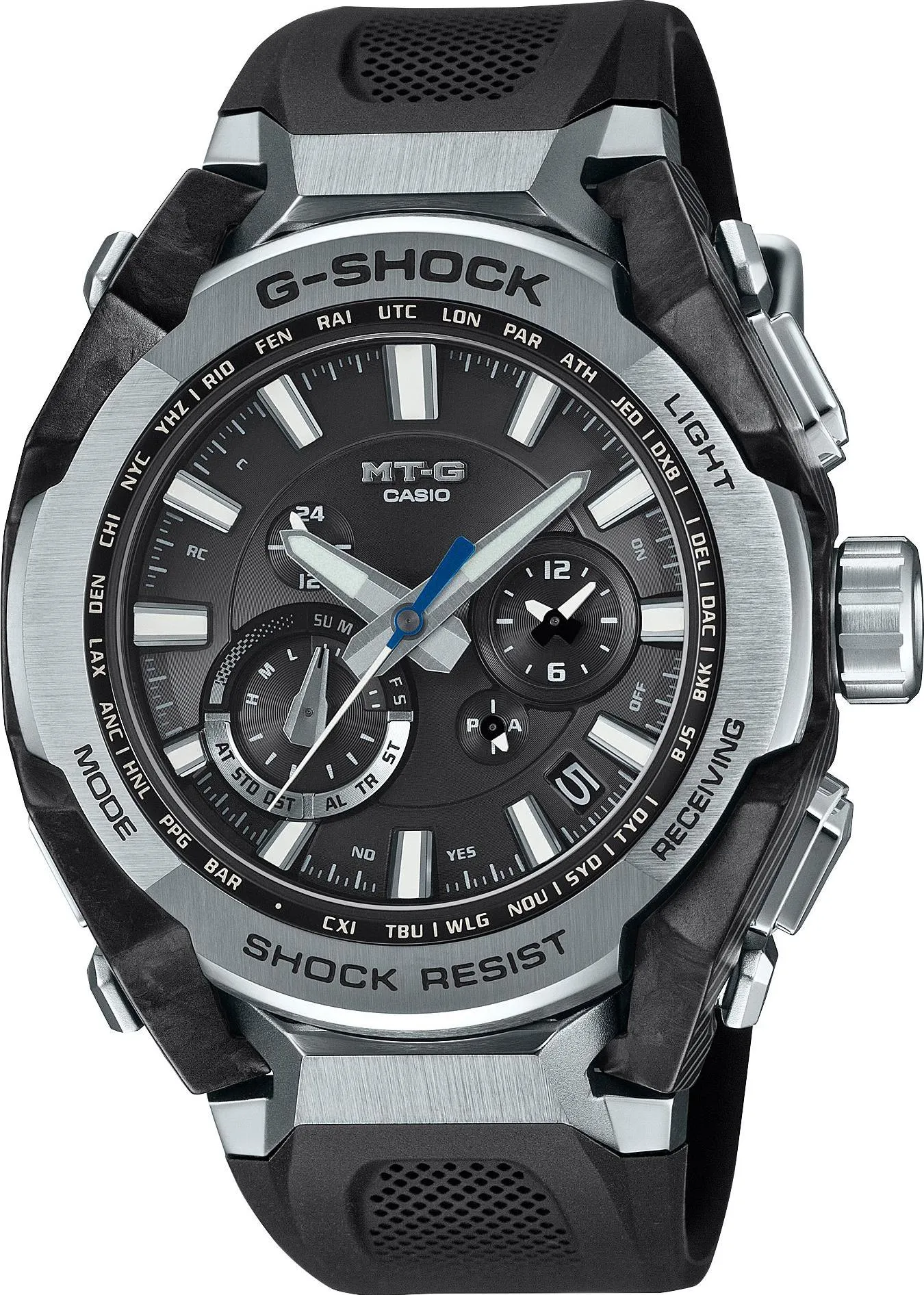 Часы G-Shock MTG-B4000 являют собой отличный пример синергии современного искусственного интеллекта и людей, творчески объединяющих свои возможности для создания продуктов, выходящих на новый уровень и раздвигающих привычные границы дизайна. Сложный объемный каркас часов выполнен из ламинированных листов карбона и стекловолокна, создавая необычный многослойный рисунок по краям корпуса. Стальные части безеля получили комбинированную обработку высочайшего уровня, совмещая зеркальные поверхности с изысканным текстурным сатинированием. Обновленный модуль часов надежно защищен карбоновым монококом по зарекомендовавшей себя технологии TRIPLE G RESIST от перегрузок, центробежной силы и различных, даже самых мощных вибраций. Присутствует и классическая для джишоков водозащита в 200 метров. Питаются часы от любого источника света благодаря встроенной солнечной батарее. Точность времени хода достигается гибридной системой: автоматической синхронизацией по 6-канальному радио-сигналу с атомными часами на разных континентах и через связь со смартфоном посредством Bluetooth.