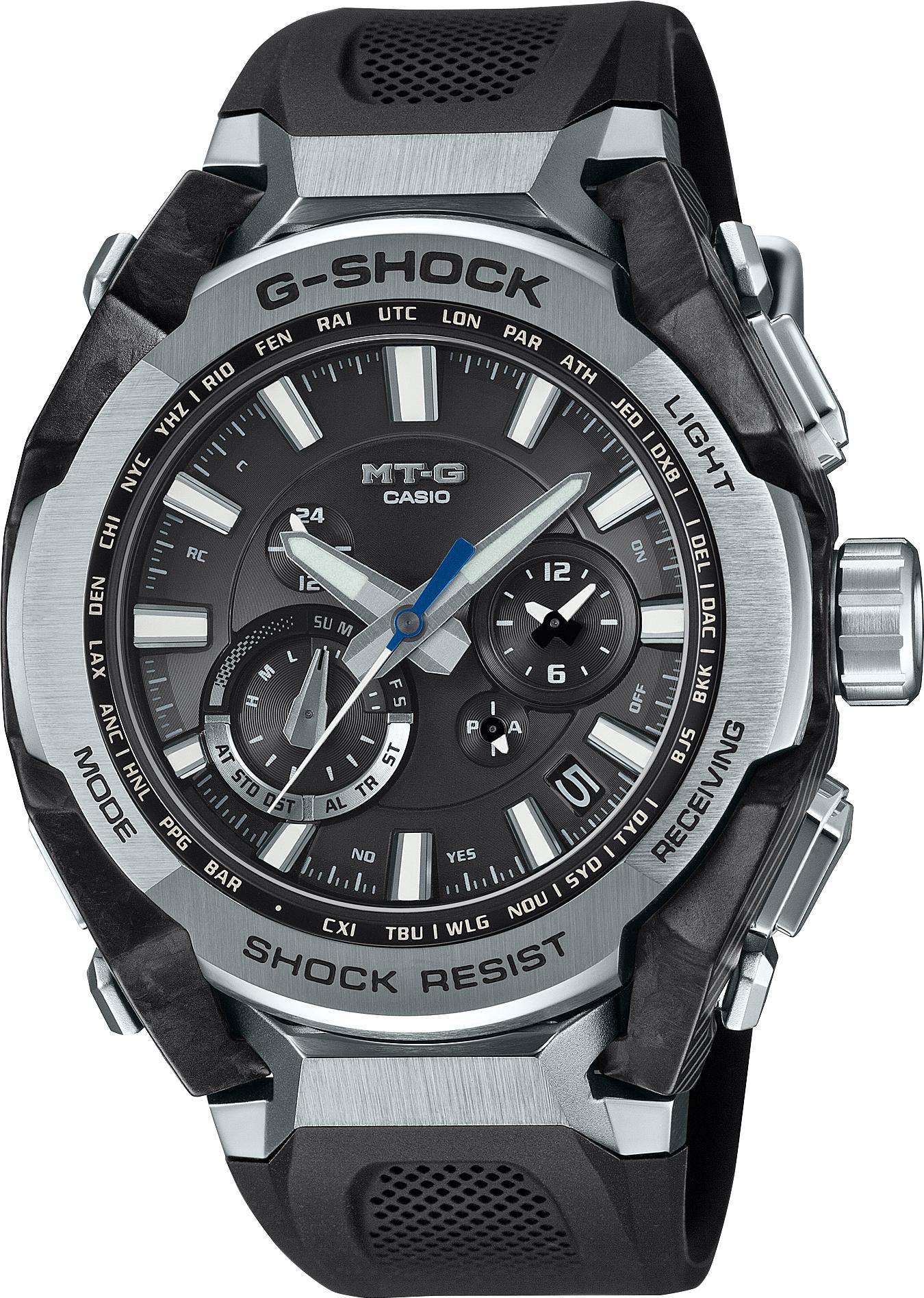 Часы G-Shock MTG-B4000 являют собой отличный пример синергии современного искусственного интеллекта и людей, творчески объединяющих свои возможности для создания продуктов, выходящих на новый уровень и раздвигающих привычные границы дизайна. Сложный объемный каркас часов выполнен из ламинированных листов карбона и стекловолокна, создавая необычный многослойный рисунок по краям корпуса. Стальные части безеля получили комбинированную обработку высочайшего уровня, совмещая зеркальные поверхности с изысканным текстурным сатинированием. Обновленный модуль часов надежно защищен карбоновым монококом по зарекомендовавшей себя технологии TRIPLE G RESIST от перегрузок, центробежной силы и различных, даже самых мощных вибраций. Присутствует и классическая для джишоков водозащита в 200 метров. Питаются часы от любого источника света благодаря встроенной солнечной батарее. Точность времени хода достигается гибридной системой: автоматической синхронизацией по 6-канальному радио-сигналу с атомными часами на разных континентах и через связь со смартфоном посредством Bluetooth.<br />