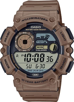 Мужские наручные часы Casio Sports WS-1500H-5A. Точный кварцевый механизм с цифровой индикацей. В отличие от механических часов, не требуют завода и работают от батареи, показывая отклонение всего несколько секунд в месяц. Светодиодная подсветка обеспечивает равномерное и энергоэффективное освещение циферблата. Для активации обычно требуется нажатие отдельной кнопки, что позволяет экономить заряд батареи.Полимерный ремешок. Натуральный полимерный материал является идеальным для изготовления ремешка благодаря своей чрезвычайной прочности и гибкости. После настройки автоматический календарь всегда отображает точную дату. Аккумулятор обеспечивает часы достаточным питанием приблизительно на 10 лет. Функция будильника. Функция хронографа. Отображение текущего времени в основных городах и конкретных областях по всему миру. Функция таймера. Таймеры обратного отсчета напомнят Вам о текущих или особенных событиях, издав звуковой сигнал в установленное время. Ударопрочная конструкция часов защищает от ударов и вибрации. Отображение времени возможно в 12-часовом или 24-часовом формате. Полимерный корпус надежно защищает часы от механических повреждений. Органическое стекло. Часы являются водонепроницаемыми до 10 Бар. Цвет корпуса: Коричневый. Цвет циферблата: Коричневый. Высота (с ушками): 54.5 мм. Толщина: 16.8 мм. Гарантия: 2 года. Другие наименования модели: WS-1500H-5AVDF, WS-1500H-5AVD, WS-1500H-5AV.