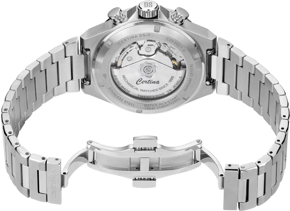 Certina Мужские швейцарские часы DS-7 C043.427.11.041.00. Механические с автоподзаводом. Пружина механизма заводится автоматически благодаря естественным движениям владельца в процессе ежедневной носки часов. На стрелки и отметки нанесен светонакопительный состав, благодаря этому считывать информацию с циферблата возможно и в темноте. Браслет из нержавеющей стали обладает высокой прочностью и износостойкостью, обеспечивая долговечность даже при активной эксплуатации. Материал устойчив к коррозии и сохраняет свой внешний вид надолго. Функция хронографа. Корпус изготовлен из высококачественной нержавеющей стали 316L с высокими антикоррозийными свойствами. Сапфировое стекло. Искусственно изготовленное стекло с высокой прочностью и устойчивостью к царапинам. Часы являются водонепроницаемыми до 10 Бар. Цвет корпуса: Серебристый. Цвет циферблата: Синий. Толщина: 14.87 мм. Гарантия: 2 года. Другие наименования модели: C0434271104100.