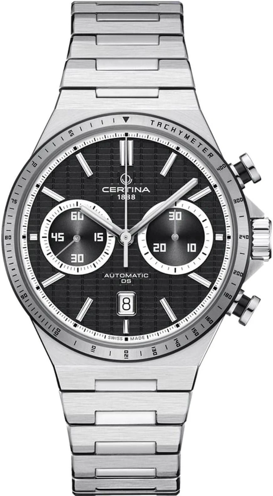 Certina Мужские швейцарские часы DS-7 C043.427.21.051.00. Механические с автоподзаводом. Пружина механизма заводится автоматически благодаря естественным движениям владельца в процессе ежедневной носки часов. На стрелки и отметки нанесен светонакопительный состав, благодаря этому считывать информацию с циферблата возможно и в темноте. Браслет из нержавеющей стали обладает высокой прочностью и износостойкостью, обеспечивая долговечность даже при активной эксплуатации. Материал устойчив к коррозии и сохраняет свой внешний вид надолго. Корпус изготовлен из высококачественной нержавеющей стали 316L с высокими антикоррозийными свойствами. Сапфировое стекло. Искусственно изготовленное стекло с высокой прочностью и устойчивостью к царапинам. Часы являются водонепроницаемыми до 10 Бар. Цвет корпуса: Серебристый. Цвет циферблата: Черный. Высота (с ушками): 42 мм. Толщина: 14.87 мм. Гарантия: 2 года. Другие наименования модели: C0434272105100.
