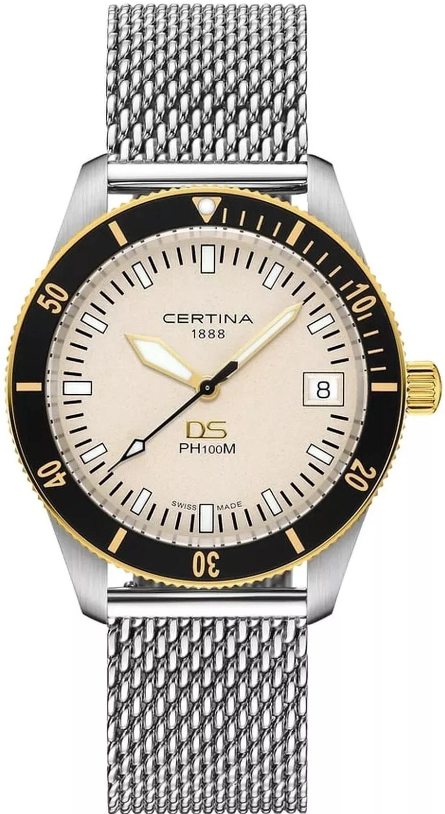 Certina Мужские швейцарские часы DS PH100M C044.410.21.030.00. Точный кварцевый механизм с аналоговой индикацией. В отличие от механических часов, не требуют завода и работают от батареи, показывая отклонение всего несколько секунд в месяц. На стрелки и отметки нанесен светонакопительный состав, благодаря этому считывать информацию с циферблата возможно и в темноте. Браслет из нержавеющей стали обладает высокой прочностью и износостойкостью, обеспечивая долговечность даже при активной эксплуатации. Материал устойчив к коррозии и сохраняет свой внешний вид надолго. Индикатор запаса хода. После настройки автоматический календарь всегда отображает точную дату. Корпус изготовлен из высококачественной нержавеющей стали 316L с высокими антикоррозийными свойствами. Сапфировое стекло. Искусственно изготовленное стекло с высокой прочностью и устойчивостью к царапинам. Часы являются водонепроницаемыми до 10 Бар. Цвет корпуса: Серебристый. Цвет корпуса: Черный. Цвет корпуса: Желтое золото. Цвет циферблата: Бежевый. Толщина: 10 мм. Гарантия: 2 года.