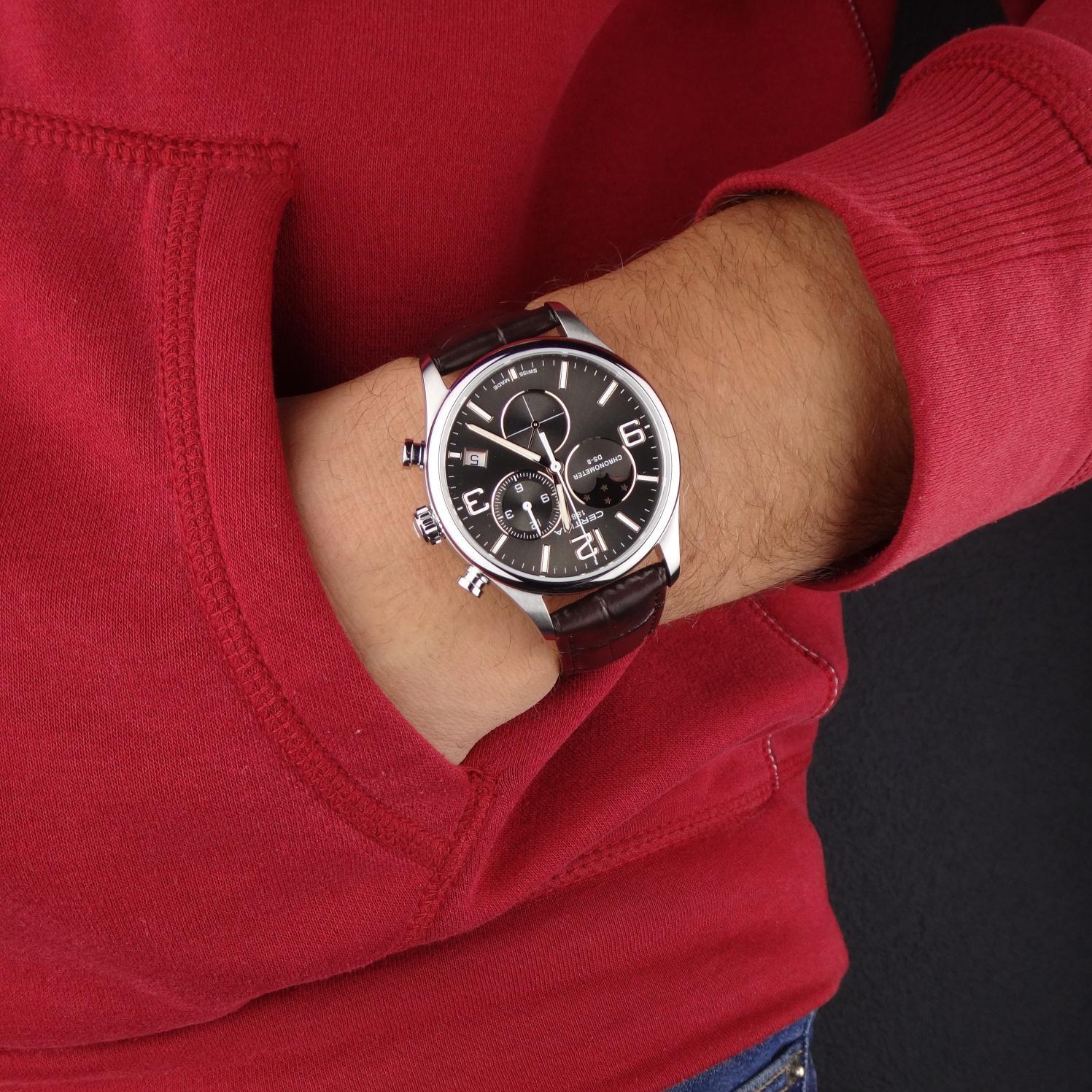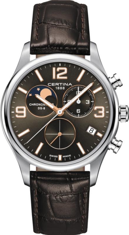 Мужские наручные часы Certina DS-8 C033.460.16.087.00. Точный кварцевый механизм с аналоговой индикацией. Корпус изготовлен из высококачественной нержавеющей стали 316L с высокими антикоррозийными свойствами. На стрелки и отметки нанесен светонакопительный состав, благодаря этому считывать информацию с циферблата возможно и в темноте. На циферблате отображается текущее число месяца. Функция хронографа. Ремешок изготовлен из кожи. Сапфировое стекло. Искусственно изготовленное стекло с высокой прочностью и устойчивостью к царапинам. Часы являются водонепроницаемыми до 10 Бар. Цвет корпуса: Серебристый. Цвет циферблата: Коричневый. Ширина (с заводной головкой): 42мм. Толщина: 12мм. Гарантия: 2 года.
