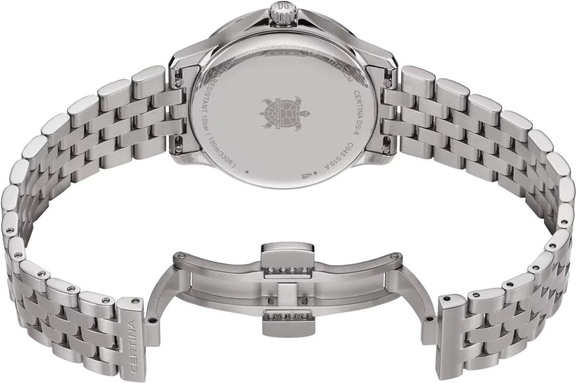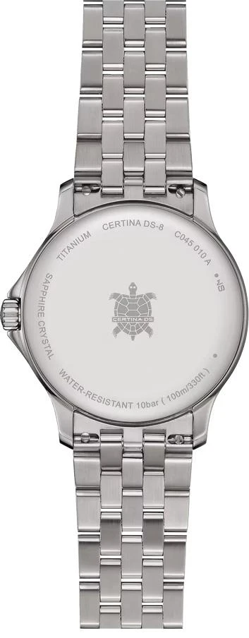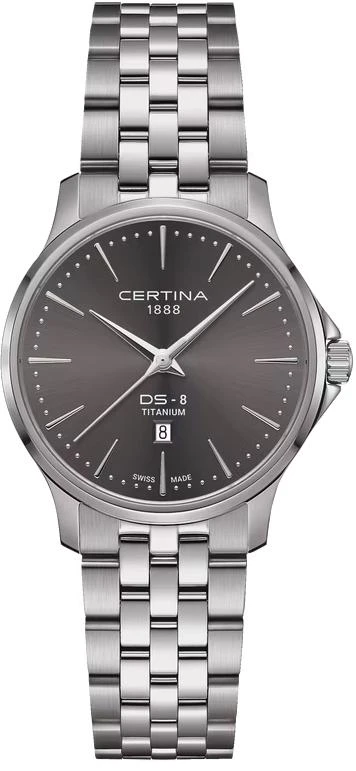 Certina Женские швейцарские часы DS-8 C045.010.44.081.00. Точный кварцевый механизм с аналоговой индикацией. В отличие от механических часов, не требуют завода и работают от батареи, показывая отклонение всего несколько секунд в месяц. Титановый браслет. В отличие от стальных, титановый значительно легче при сопоставимой прочности, что повышает комфорт при ношении. Индикатор запаса хода. Корпус изготовлен из высокопрочного титана. Сапфировое стекло. Искусственно изготовленное стекло с высокой прочностью и устойчивостью к царапинам. Часы являются водонепроницаемыми до 10 Бар. Цвет корпуса: Серебристый. Цвет циферблата: Серый. Толщина: 7.95 мм. Гарантия: 2 года.