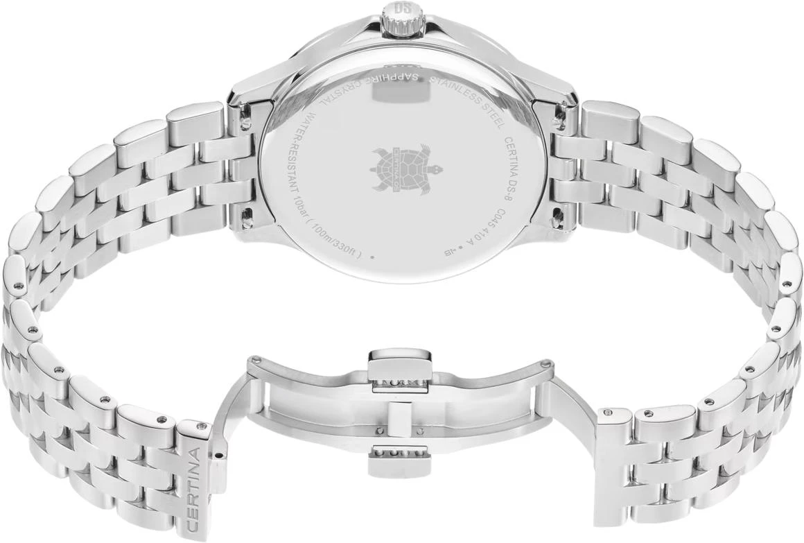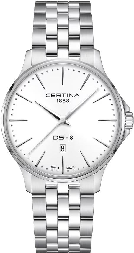 Certina Мужские швейцарские часы DS-8 C045.410.11.011.00. Точный кварцевый механизм с аналоговой индикацией. В отличие от механических часов, не требуют завода и работают от батареи, показывая отклонение всего несколько секунд в месяц. Браслет из нержавеющей стали обладает высокой прочностью и износостойкостью, обеспечивая долговечность даже при активной эксплуатации. Материал устойчив к коррозии и сохраняет свой внешний вид надолго. Индикатор запаса хода. Корпус изготовлен из высококачественной нержавеющей стали 316L с высокими антикоррозийными свойствами. Сапфировое стекло. Искусственно изготовленное стекло с высокой прочностью и устойчивостью к царапинам. Часы являются водонепроницаемыми до 10 Бар. Цвет корпуса: Серебристый. Цвет циферблата: Белый. Толщина: 8.35 мм. Гарантия: 2 года.