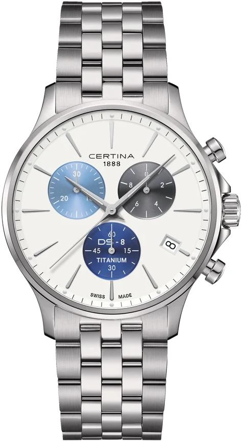 Certina Мужские швейцарские часы DS-8 C045.417.44.011.00. Точный кварцевый механизм с аналоговой индикацией. В отличие от механических часов, не требуют завода и работают от батареи, показывая отклонение всего несколько секунд в месяц. На стрелки и отметки нанесен светонакопительный состав, благодаря этому считывать информацию с циферблата возможно и в темноте. Титановый браслет. В отличие от стальных, титановый значительно легче при сопоставимой прочности, что повышает комфорт при ношении. Функция хронографа. Индикатор запаса хода. Корпус изготовлен из высокопрочного титана. Сапфировое стекло. Искусственно изготовленное стекло с высокой прочностью и устойчивостью к царапинам. Часы являются водонепроницаемыми до 10 Бар. Цвет корпуса: Серебристый. Цвет циферблата: Белый. Цвет циферблата: Черный. Цвет циферблата: Голубой. Цвет циферблата: Синий. Толщина: 12 мм. Гарантия: 2 года.