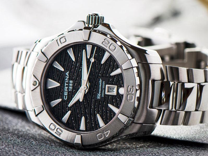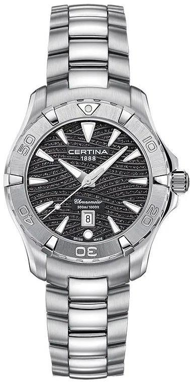 <b>Женские наручные часы Certina DS Action C032.251.11.051.09.</b> Точный кварцевый механизм с аналоговой индикацией. Корпус изготовлен из высококачественной нержавеющей стали 316L с высокими антикоррозийными свойствами. На стрелки и отметки нанесен светонакопительный состав, благодаря этому считывать информацию с циферблата возможно и в темноте. На циферблате отображается текущее число месяца. Браслет из нержавеющей стали. Сапфировое стекло. Искусственно изготовленное стекло с высокой прочностью и устойчивостью к царапинам. Часы являются водонепроницаемыми до 30 Бар. Цвет корпуса: Серебристый. Цвет циферблата: Черный. Ширина (с заводной головкой): 34мм. Толщина: 10мм. Гарантия: 2 года.
