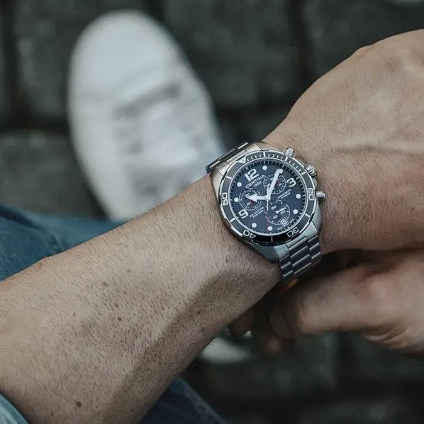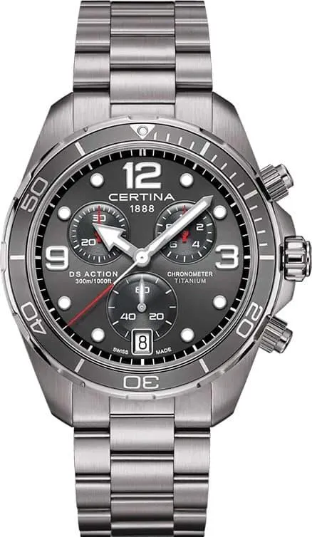 Мужские наручные часы Certina DS Action C032.434.44.087.00. Точный кварцевый механизм с аналоговой индикацией. Корпус изготовлен из высокопросчного титана. На стрелки и отметки нанесен светонакопительный состав, благодаря этому считывать информацию с циферблата возможно и в темноте. На циферблате отображается текущее число месяца. Функция хронографа. Титановый браслет. Сапфировое стекло. Искусственно изготовленное стекло с высокой прочностью и устойчивостью к царапинам. Часы являются водонепроницаемыми до 30 Бар. Цвет корпуса: Серый. Цвет циферблата: Серый. Ширина (с заводной головкой): 43мм. Толщина: 12мм. Гарантия: 2 года.
