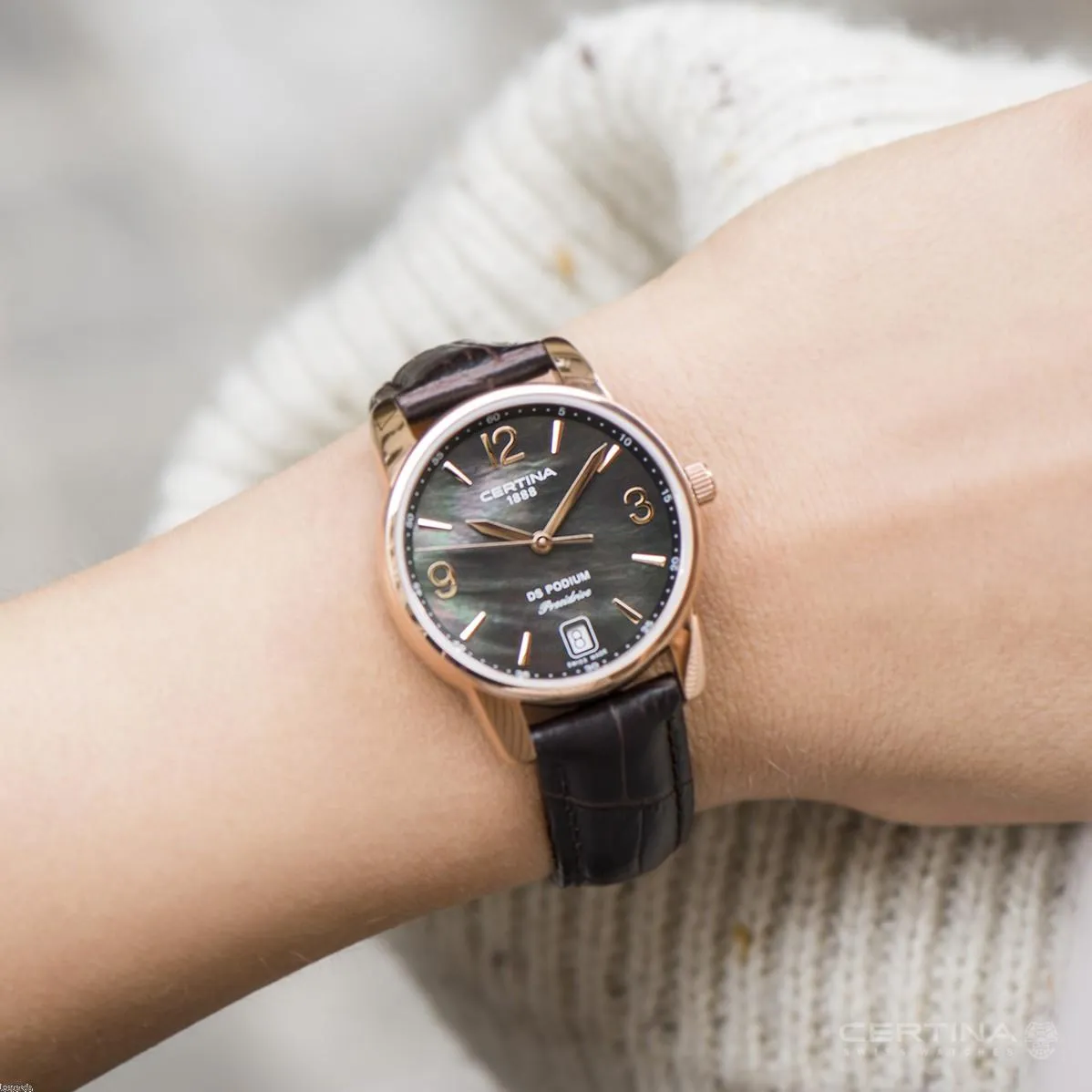 <b>Женские наручные часы Certina DS Podium C034.210.36.127.00.</b> Точный кварцевый механизм с аналоговой индикацией. Корпус изготовлен из высококачественной нержавеющей стали 316L с высокими антикоррозийными свойствами. На циферблате отображается текущее число месяца. Ремешок изготовлен из кожи. Сапфировое стекло. Искусственно изготовленное стекло с высокой прочностью и устойчивостью к царапинам. Часы являются водонепроницаемыми до 10 Бар. Цвет корпуса: Розовое золото. Цвет циферблата: Серый. Гарантия: 2 года.