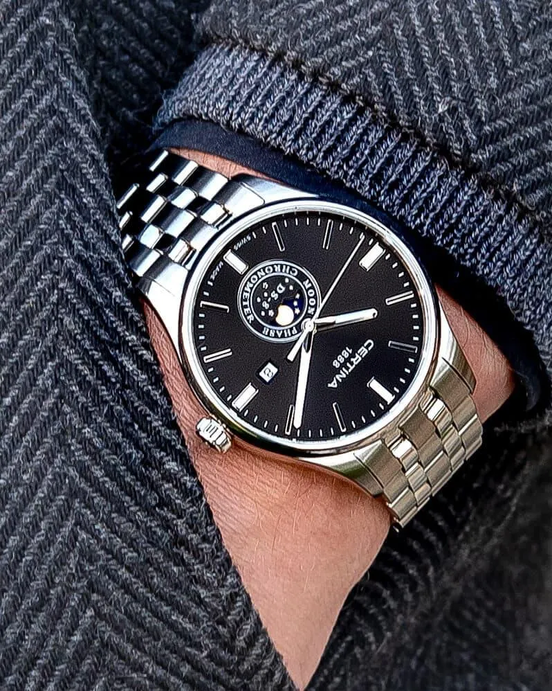 <b>Мужские наручные часы Certina Moon Phase C033.457.11.051.00.</b> Точный кварцевый механизм с аналоговой индикацией. Корпус изготовлен из высококачественной нержавеющей стали 316L с высокими антикоррозийными свойствами. На стрелки и отметки нанесен светонакопительный состав, благодаря этому считывать информацию с циферблата возможно и в темноте. На циферблате отображается текущее число месяца. Браслет из нержавеющей стали. Сапфировое стекло. Искусственно изготовленное стекло с высокой прочностью и устойчивостью к царапинам. Часы являются водонепроницаемыми до 10 Бар. Цвет корпуса: Серебристый. Цвет циферблата: Черный. Гарантия: 2 года.