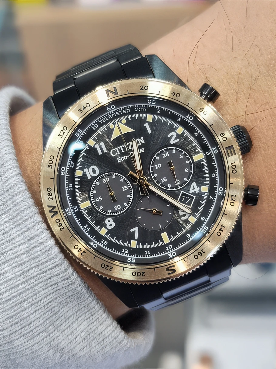 Мужские наручные часы Citizen Eco-Drive Chrono CA4556-89E. Точный кварцевый механизм с аналоговой индикацией. Браслет из нержавеющей стали. Функция хронографа. Отображение времени возможно в 12-часовом или 24-часовом формате. Браслет из нержавеющей стали. Прочное, устойчивое к царапинам минеральное стекло защищает часы от повреждений. На циферблате отображается текущее число месяца. Часы являются водонепроницаемыми до 10 Бар. Цвет циферблата: Желтое золото. Цвет корпуса: Черный. На стрелки и отметки нанесен светонакопительный состав, благодаря этому считывать информацию с циферблата возможно и в темноте. Толщина: 13 мм. Гарантия: 2 года.