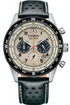 Мужские наручные часы Citizen Eco-Drive Chrono CA4559-13A. Точный кварцевый механизм с аналоговой индикацией. Ремешок изготовлен из кожи. Функция хронографа. Солнечная батарейка. Солнечная подзаряжающаяся батарейка обеспечивает питание часов для работы. Отображение времени возможно в 12-часовом или 24-часовом формате. Браслет из нержавеющей стали. Прочное, устойчивое к царапинам минеральное стекло защищает часы от повреждений. На циферблате отображается текущее число месяца. Часы являются водонепроницаемыми до 10 Бар. Цвет циферблата: Черный. Цвет корпуса: Бежевый. На стрелки и отметки нанесен светонакопительный состав, благодаря этому считывать информацию с циферблата возможно и в темноте. Толщина: 13 мм. Гарантия: 2 года.