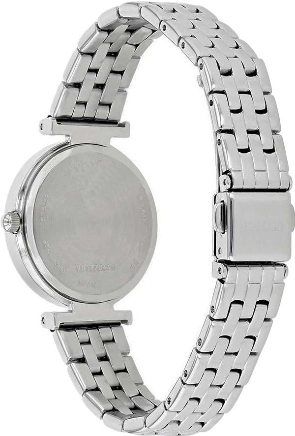 Женские кварцевые часы. Калибр механизма 9633. Центральные часовая, минутная и секундная стрелки. Розовый перламутровый циферблат. Круглый корпус выполнен из полированной нержавеющей стали и украшен кристаллами Swarovski по безелю. Диаметр корпуса составляет 30 мм, толщина 7 мм. Стальной браслет, раскладывающаяся застежка. Прочное минеральное стекло устойчивое к мелким механическим повреждениям. Водостойкость WR 50 (мытье рук, дождь).