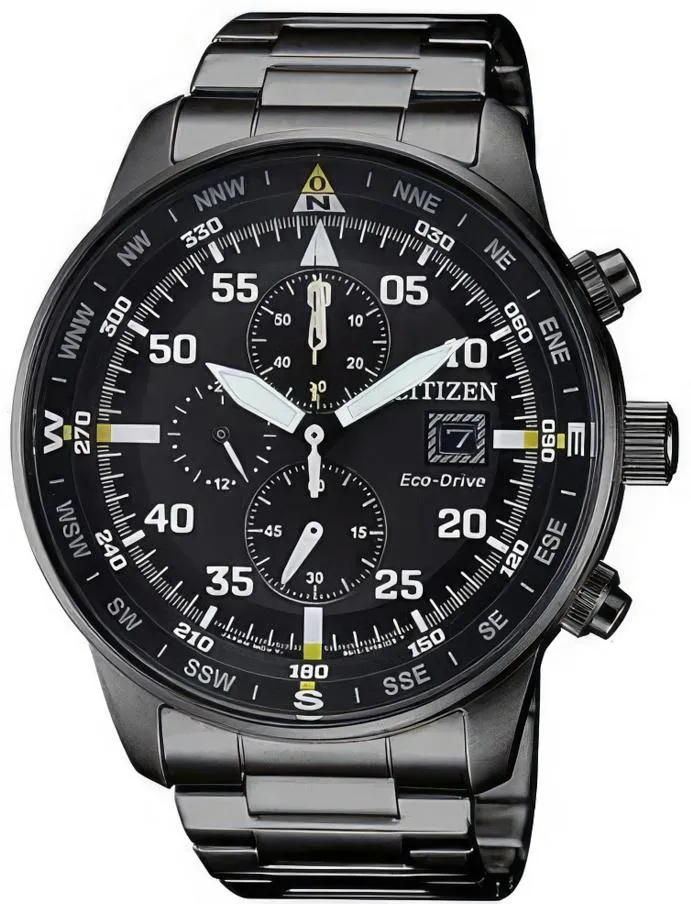 Мужские часы в активном стиле. Круглый корпус из нерж. стали с IP-покрытием на литом браслете. Минеральное стекло. Циферблат с разметкой компаса. Водостойкость 10 АТМ. Точный кварцевый механизм Eco-Drive на солнечной батарее с функцией хронографа.