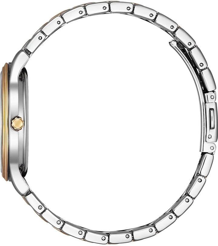 Женские часы Citizen EM0416-78A с кварцевым механизмом Eco-Drive калибра E031 работают от солнечной энергии и не требуют замены батарейки. Модель с белым циферблатом в арабскими цифрами заключена в стальной корпус диаметром 34 мм и толщиной 7 мм с золотистым IP-покрытием безеля и элементов браслета. Циферблат защищен прочным минеральным стеклом, а водонепроницаемость 5 бар (50 метров) обеспечивает защиту от брызг и дождя. Часы обладают запасом хода до 180 дней, точностью ±15 секунд в месяц и функцией индикатора заряда. Стальной браслет с раскладной застежкой (длина 330 мм) и легкий вес в 70 грамм обеспечивают комфорт при повседневной носке.