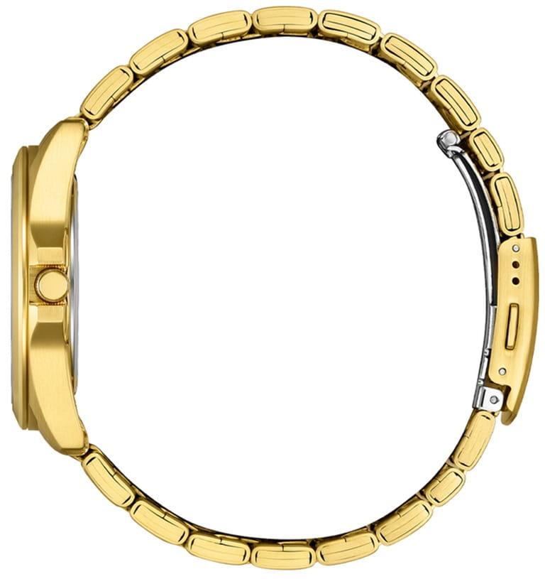 Мужские кварцевые часы Citizen BF0583-59P с японским механизмом представлены в круглом стальном корпусе диаметром 39,4 мм и толщиной 8 мм с золотистым IP-покрытием. Модель с золотистым циферблатом оснащена центральными часовой, минутной и секундной стрелками с люминесцентным покрытием, окошком даты на позиции 3 часа и аккуратными индексными метками. Стальной браслет с золотистым IP-покрытием и раскладывающейся застежкой с кнопкой дополнен минеральным стеклом, устойчивым к царапинам. Водонепроницаемость WR50 обеспечивает защиту от брызг и дождя.
