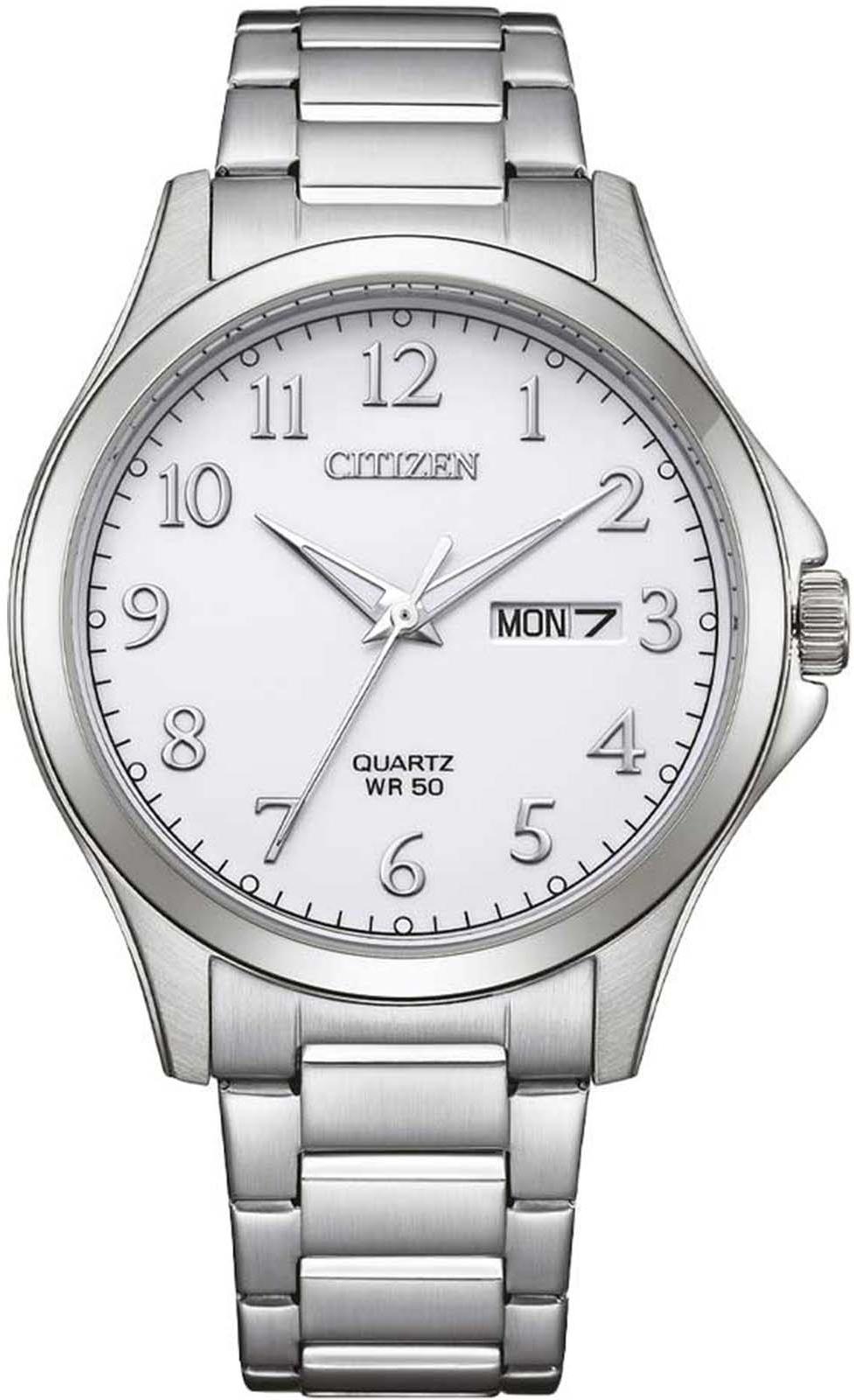 Кварцевые часы в стальном корпусе диаметром 41 мм со стальным браслетом. Модель с циферблатом, оснащенным цифровыми часовыми индексами, включает центральные часовую, минутную и секундную стрелки, а также индикацию даты и дня недели. Устойчивое к царапинам минеральное стекло обеспечивает защиту циферблата, а водостойкость WR50 позволяет носить часы во время мытья рук и под дождем.