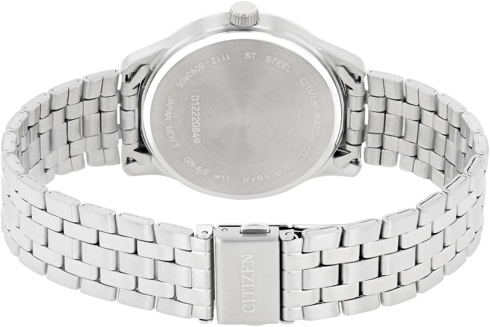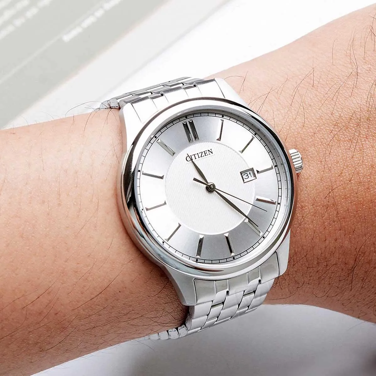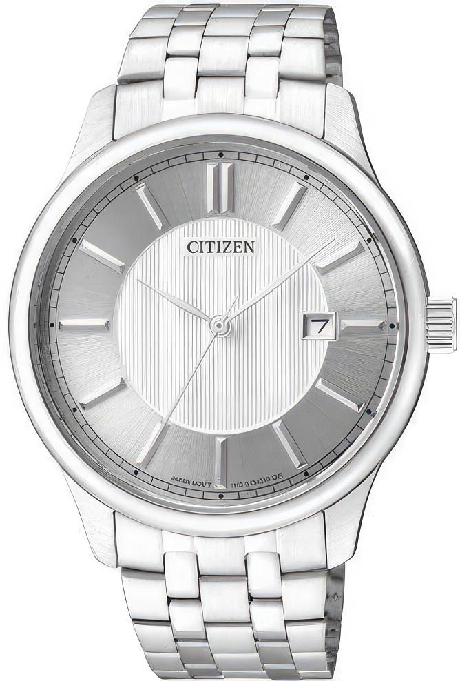 Мужские наручные часы Citizen Quartz BI1050-56A. Точный кварцевый механизм с аналоговой индикацией. Корпус изготовлен из высококачественной нержавеющей стали 316L с высокими антикоррозийными свойствами. На циферблате отображается текущее число месяца. Браслет из нержавеющей стали. Прочное, устойчивое к царапинам минеральное стекло защищает часы от повреждений. Часы являются водонепроницаемыми до 5 Бар. Цвет корпуса: Серебристый. Цвет циферблата: Серебристый. Ширина (с заводной головкой): 41мм. Толщина: 9мм. Гарантия: 2 года.