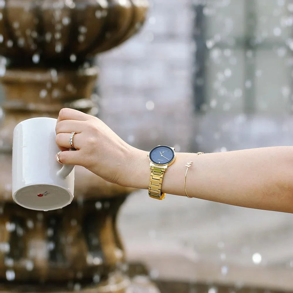 Кварцевые часы с водостойкостью WR 50 оснащены центральными часовой и минутной стрелками, в то время как секундная стрелка вынесена на отдельный циферблат. Модель с циферблатом со штриховыми индексами заключена в стальной корпус диаметром 34 мм с IP-покрытием. Браслет выполнен из нержавеющей стали с аналогичным покрытием, а циферблат защищен устойчивым к царапинам минеральным стеклом.
