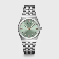 Круглые женские часы в стиле ретро 70-х годов имеют 33-миллиметровый корпус серебристого цвета, циферблат цвета шалфея в винтажном стиле со стрелками из розового золота и 20-миллиметровый серебристый ремешок из нержавеющей стали с пятью звеньями.