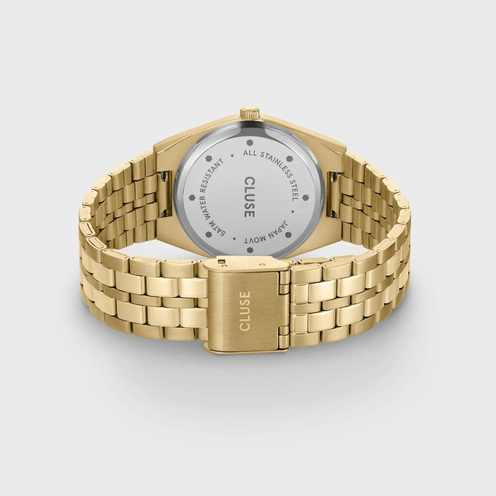 Круглые женские часы в стиле ретро 70-х годов имеют корпус золотистого цвета диаметром 33 мм, циферблат темно-зеленого цвета в винтажном стиле с золотыми стрелками и 5-звенный ремешок из нержавеющей стали золотистого цвета шириной 20 мм.