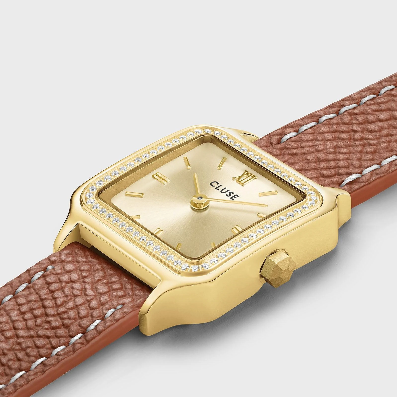 Квадратные женские часы Gracieuse Petite имеют корпус золотистого цвета диаметром 24 мм с белыми камнями на безеле, циферблат золотистого цвета и двойной ремешок из кожи орехово-коричневого цвета шириной 14 мм с белой строчкой. Легко персонализируйте свои часы с помощью любого ремешка CLUSE шириной 14 мм