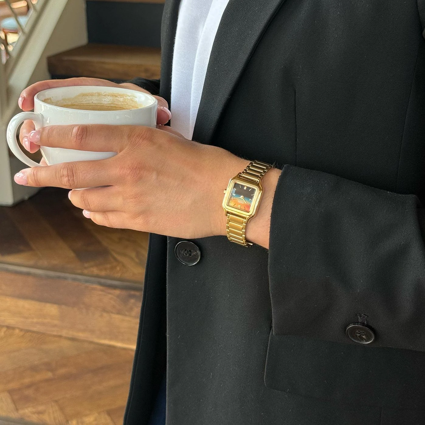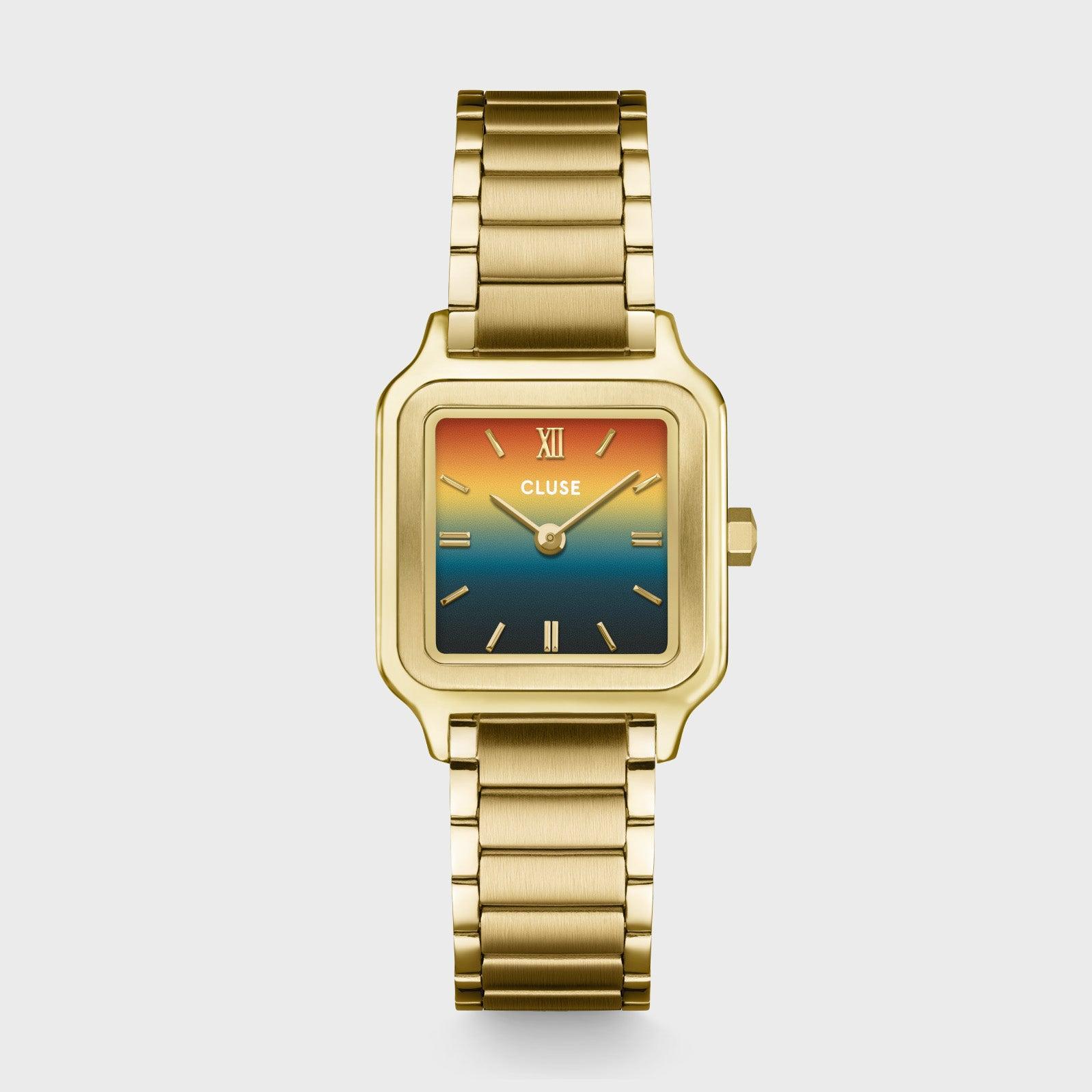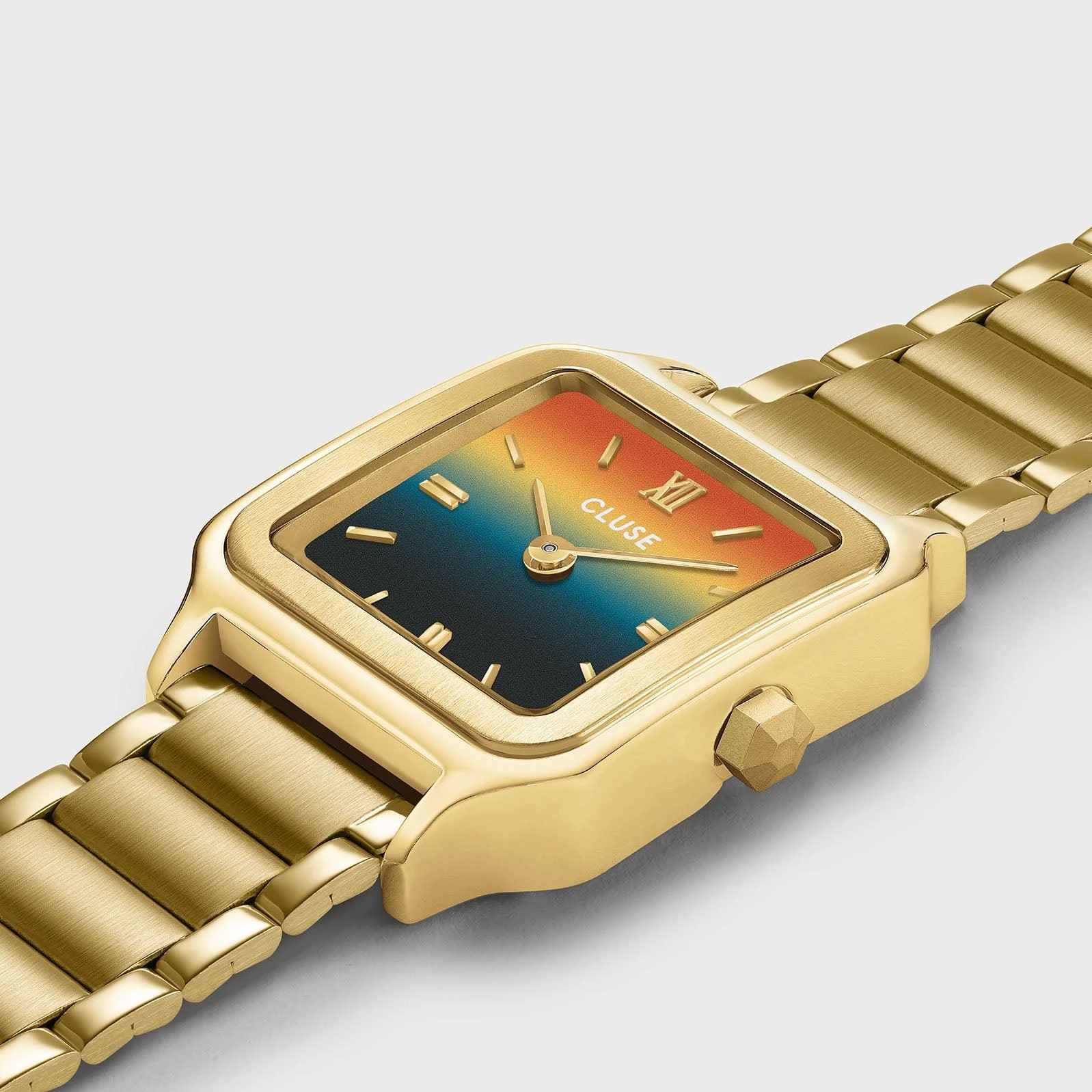 Квадратные женские часы Gracieuse Petite имеют корпус золотистого цвета диаметром 24 мм, циферблат с изображением заката и ремешок из нержавеющей стали золотистого цвета шириной 14 мм. Легко персонализируйте свои часы с помощью любого ремешка CLUSE шириной 14 мм.
