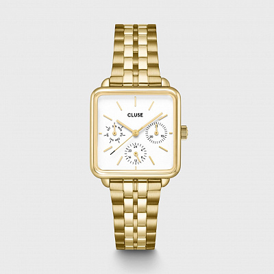 Квадратные многофункциональные часы La T?tragone для женщин имеют корпус золотистого цвета диаметром 30 мм, белый циферблат и 5-звеньевой ремешок из нержавеющей стали золотистого цвета шириной 16 мм. Легко персонализируйте свои часы с помощью любого ремешка CLUSE шириной 16 мм.