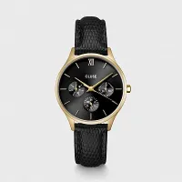 Круглые многофункциональные часы Minuit для женщин имеют корпус золотистого цвета диаметром 34 мм, черный циферблат с 3 дополнительными циферблатами и черный кожаный ремешок шириной 16 мм с эффектом кожи ящерицы. Легко персонализируйте свои часы с помощью любого ремешка CLUSE шириной 16 мм