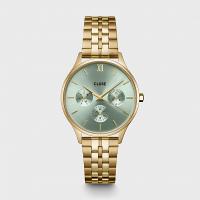 Круглые многофункциональные женские часы Minuit имеют корпус золотого цвета диаметром 34 мм, циферблат серо-зелёного цвета с тремя дополнительными циферблатами и 5-звенный ремешок из нержавеющей стали золотистого цвета шириной 16 мм. Вы можете легко персонализировать свои часы с помощью любого ремешка CLUSE шириной 16 мм.