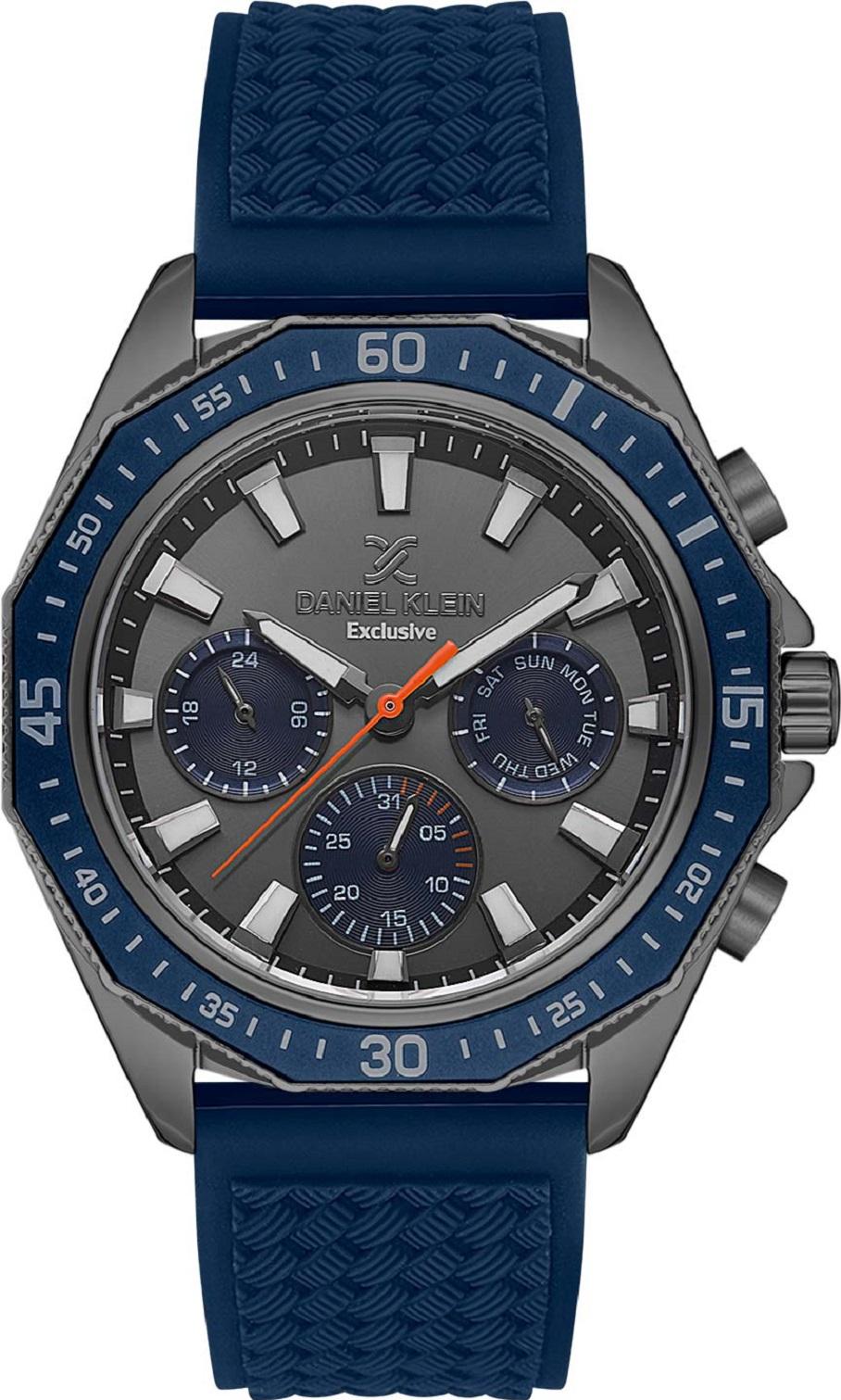 Мужские наручные часы Daniel Klein Exclusive 13639-5. Точный кварцевый механизм с аналоговой индикацией. Силиконовый ремешок. Функция хронографа. Отображение времени возможно в 12-часовом или 24-часовом формате. Латунный браслет. Прочное, устойчивое к царапинам минеральное стекло защищает часы от повреждений. На циферблате отображается текущее число месяца и день недели. Часы являются водонепроницаемыми до 5 Бар. Цвет циферблата: Синий. Цвет корпуса: Серый. На стрелки и отметки нанесен светонакопительный состав, благодаря этому считывать информацию с циферблата возможно и в темноте. Толщина: 12 мм. Гарантия: 1 год.