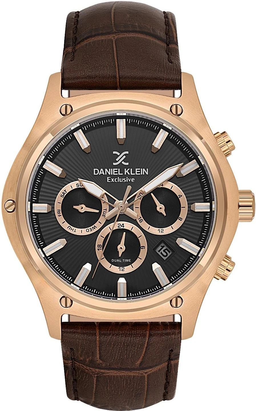 Мужские наручные часы Daniel Klein Exclusive 14056-5. Точный кварцевый механизм с аналоговой индикацией. В отличие от механических часов, не требуют завода и работают от батареи, показывая отклонение всего несколько секунд в месяц. На стрелки и отметки нанесен светонакопительный состав, благодаря этому считывать информацию с циферблата возможно и в темноте. Ремешок изготовлен из кожи. Гибкость такого ремешка позволяет точно регулировать посадку часов на руке. Отображение времени возможно в 12-часовом или 24-часовом формате. Корпус изготовлен из высококачественной часовой латуни с высокими антикоррозийными свойствами. Прочное, устойчивое к царапинам минеральное стекло защищает часы от повреждений. Часы являются водонепроницаемыми до 5 Бар. Цвет корпуса: Розовое золото. Цвет циферблата: Черный. Высота (с ушками): 44 мм. Толщина: 12 мм. Гарантия: 1 год.
