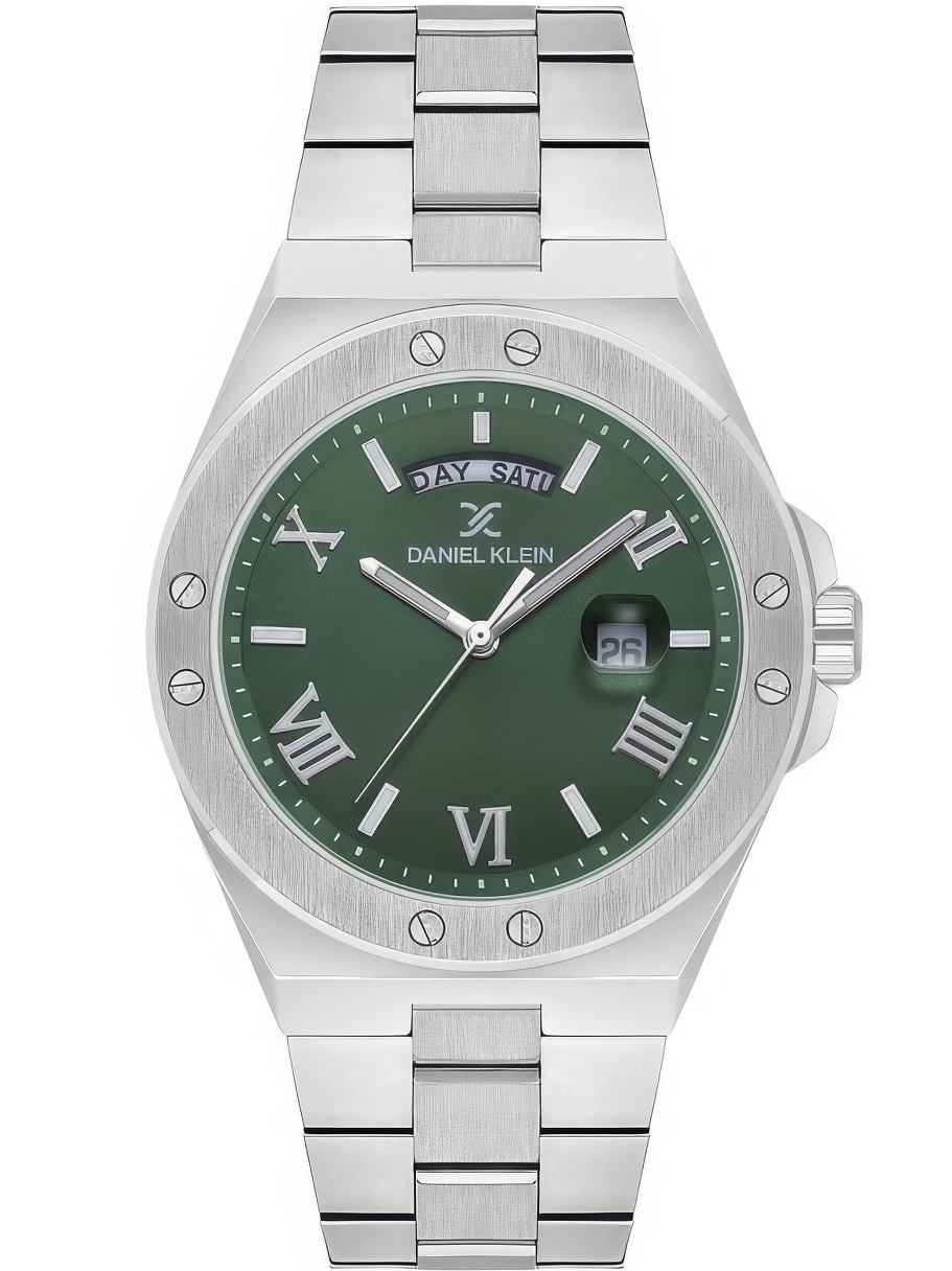 Мужские наручные часы Daniel Klein Premium 13736-3. Точный кварцевый механизм с аналоговой индикацией. Браслет из нержавеющей стали. Латунный браслет. Прочное, устойчивое к царапинам минеральное стекло защищает часы от повреждений. На циферблате отображается текущее число месяца и день недели. Часы являются водонепроницаемыми до 5 Бар. Цвет циферблата: Серебристый. Цвет корпуса: Зеленый. На стрелки и отметки нанесен светонакопительный состав, благодаря этому считывать информацию с циферблата возможно и в темноте. Толщина: 10 мм. Гарантия: 1 год.