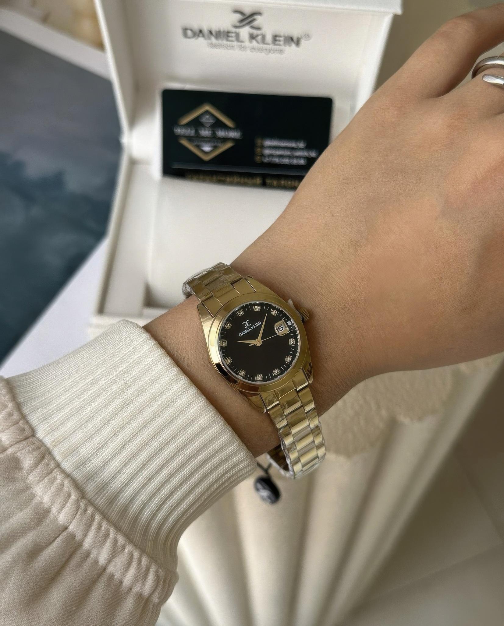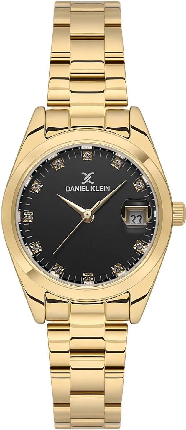 Женские наручные часы Daniel Klein Premium 13758-5. Точный кварцевый механизм с аналоговой индикацией. Браслет из нержавеющей стали. После настройки автоматический календарь всегда отображает точную дату. Латунный браслет. Прочное, устойчивое к царапинам минеральное стекло защищает часы от повреждений. На циферблате отображается текущее число месяца. Часы являются водонепроницаемыми до 3 Бар. Цвет циферблата: Желтое золото. Цвет корпуса: Черный. Толщина: 7 мм. Гарантия: 1 год.